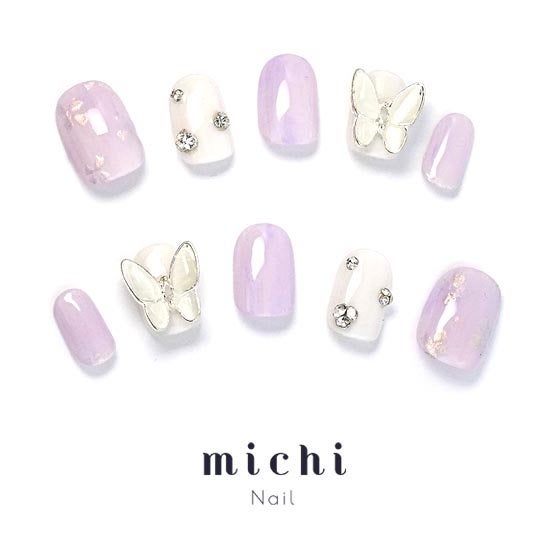パステルパープルとホワイトの組み合わせがとってもかわいいバタフライネイル。大きなバタフライとVカットストーンで、上品だけど特別感のあるデザインです。親指にはひっそりとオーロラのお花が描かれています。