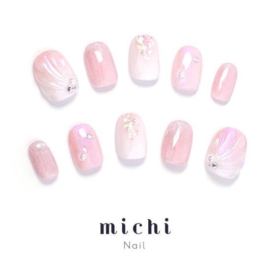 スイートなベビーピンクがかわいい夏の定番シェルネイル。さりげないストーンやパールがキラッと輝く上品なデザインです。先端に集めたオーロラミラーが見る角度によってパープルっぽく光るのも魅了です♪