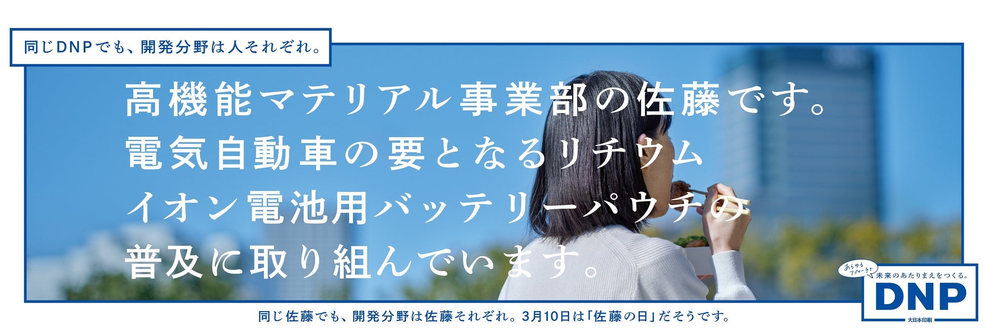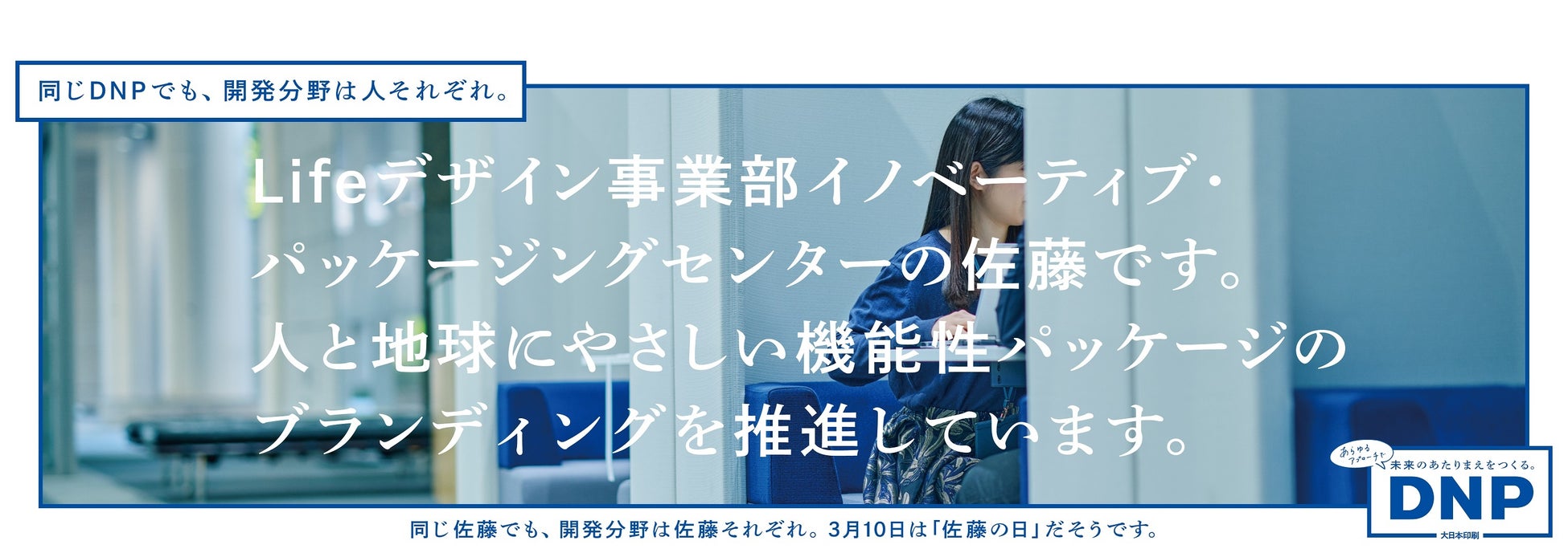 DNPは、持続可能なより良い社会、より心豊かな暮らしの実現に向け、多岐にわたる事業分野で、独自の「P&I」(印刷と情報)の強みを掛け合わせ、新しい価値の創出に取り組んでいます。2022年3月にスタートした企業広告シリーズでも、同じ会社と思えないような“まるでちがう”事業に取り組む社員同士の“社内異業種交流”をトークショー風に紹介しています。今回は、毎年3月10日の「佐藤の日」に合わせて、一連の企業広告シリーズの派生企画として、以下の期間に実施します。