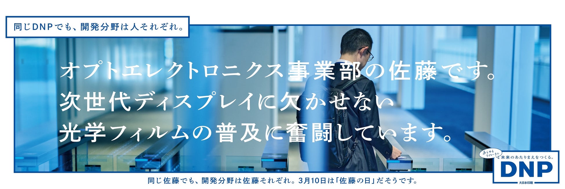 大日本印刷株式会社(DNP)は、2023年3月3日(金)から期間限定で、東京と大阪3路線の電車をジャックし、史上初めて(DNP調べ/2023年2月時点)、電車内の広告すべてが“佐藤さん”になる企業広告の企画を展開します。DNPのさまざまな部門で働く“佐藤さん”が「同じ佐藤でも開発分野は佐藤それぞれ」を合言葉に、幅広い事業領域と多様なアプローチで、「未来のあたりまえをつくる。」というブランドステートメントを実現していくDNPグループの姿を発信します。