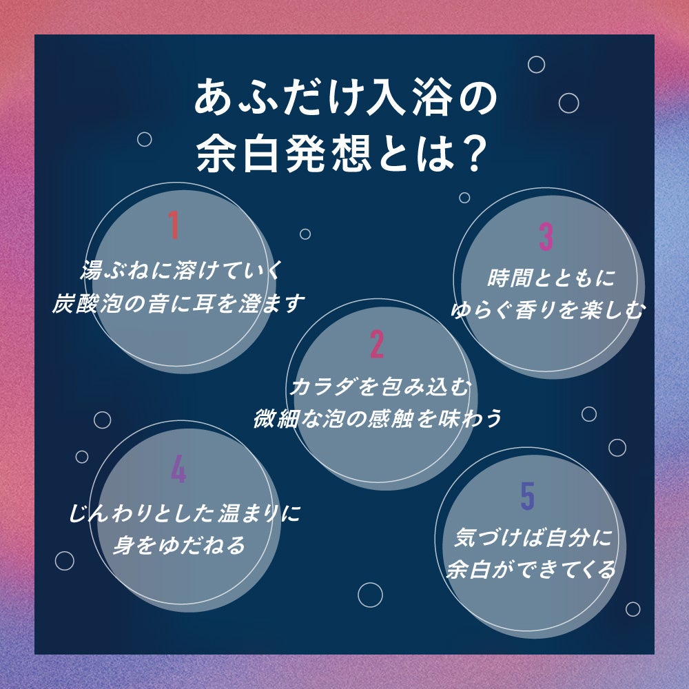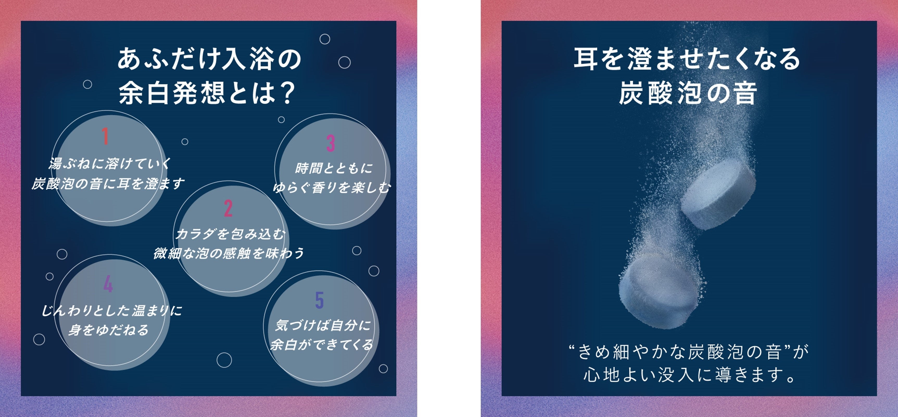 情報過多な現代だからこそ、“なにもしない、を、あえてやる”「余白時間」を入浴時に求めている若年層の実態に着目。同商品は、約10分間継続する炭酸泡の音や心地よい香りといった、ゆったりとした感覚に身をゆだねることで、ノイズとなる様々な情報をシャットアウトする “没入入浴”を促します。これにより生まれた「余白時間」によって、自身からあふれだすアイディア等に喜びを感じてもらうという、新しい入浴体験を提案いたします。