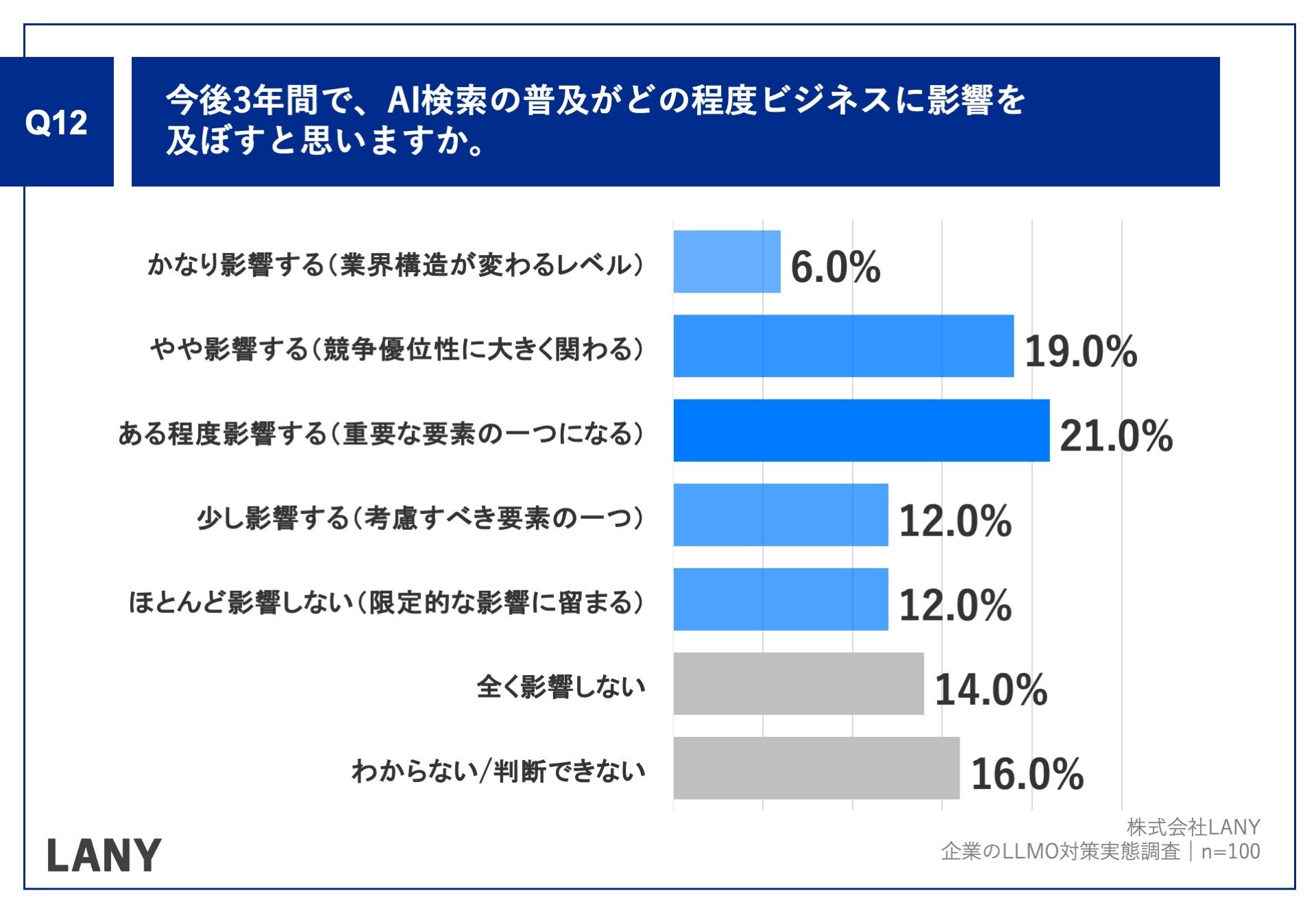 「Q12.今後3年間で、AI検索の普及がどの程度ビジネスに影響を及ぼすと思いますか。」(n=100)と質問したところ、「ある程度影響する(重要な要素の一つになる)」が21.0%、「やや影響する(競争優位性に大きく関わる)」が19.0%、「少し影響する(考慮すべき要素の一つ)」が12.0%という回答となりました。