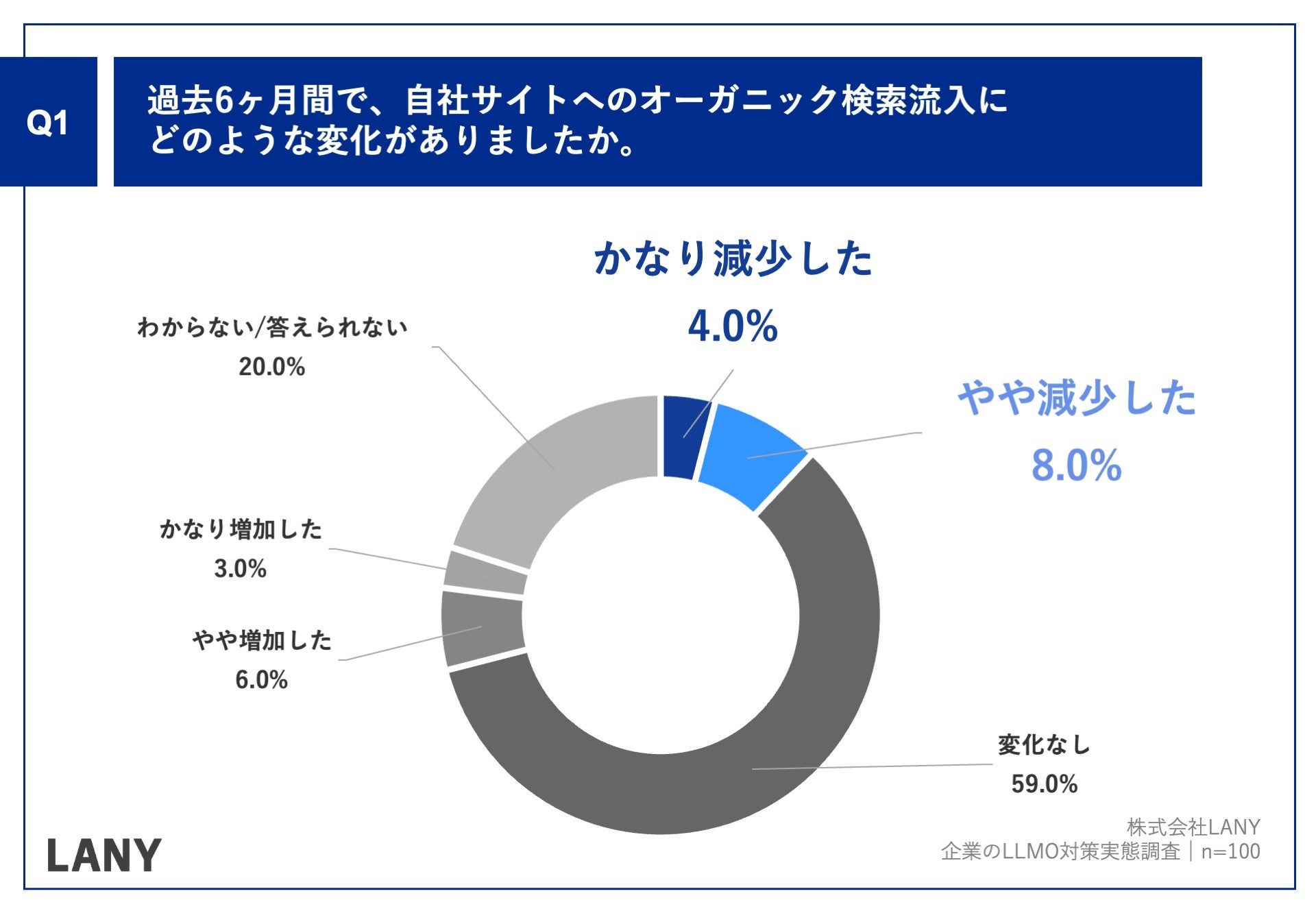 「Q1.過去6ヶ月間で、自社サイトへのオーガニック検索流入にどのような変化がありましたか。」(n=100)と質問したところ、「かなり減少した」が4.0%、「やや減少した」が8.0%という回答となりました。
