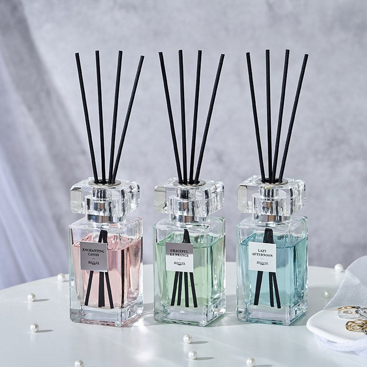 光を受けて輝く香水瓶のようなデザインが美しいリードディフューザー。
