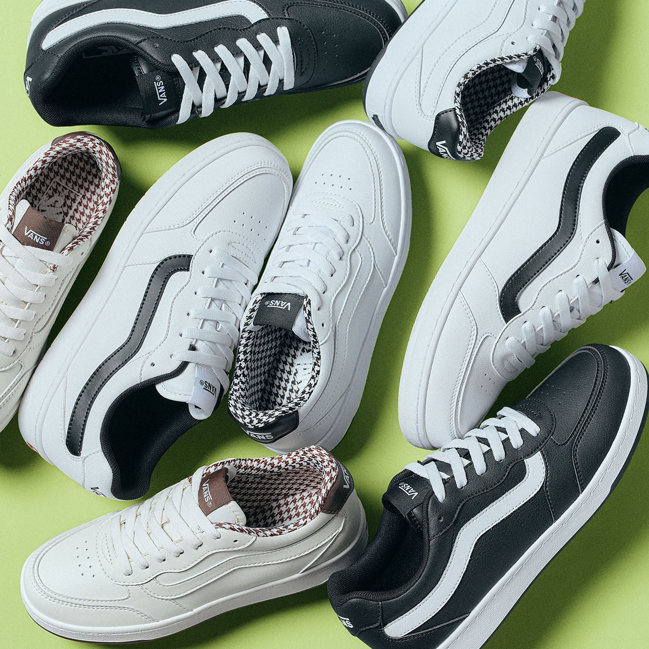 新作のデザインは、日本限定企画であり、足を入れる際に見えるかかとの内側部分(腰裏)を千鳥柄のテキスタイルにしており、さりげないアクセントの効いた1足です。また、白レザーベースのシューズのため、どんなファッションにも合わせやすく使い勝手の良さがポイントです。