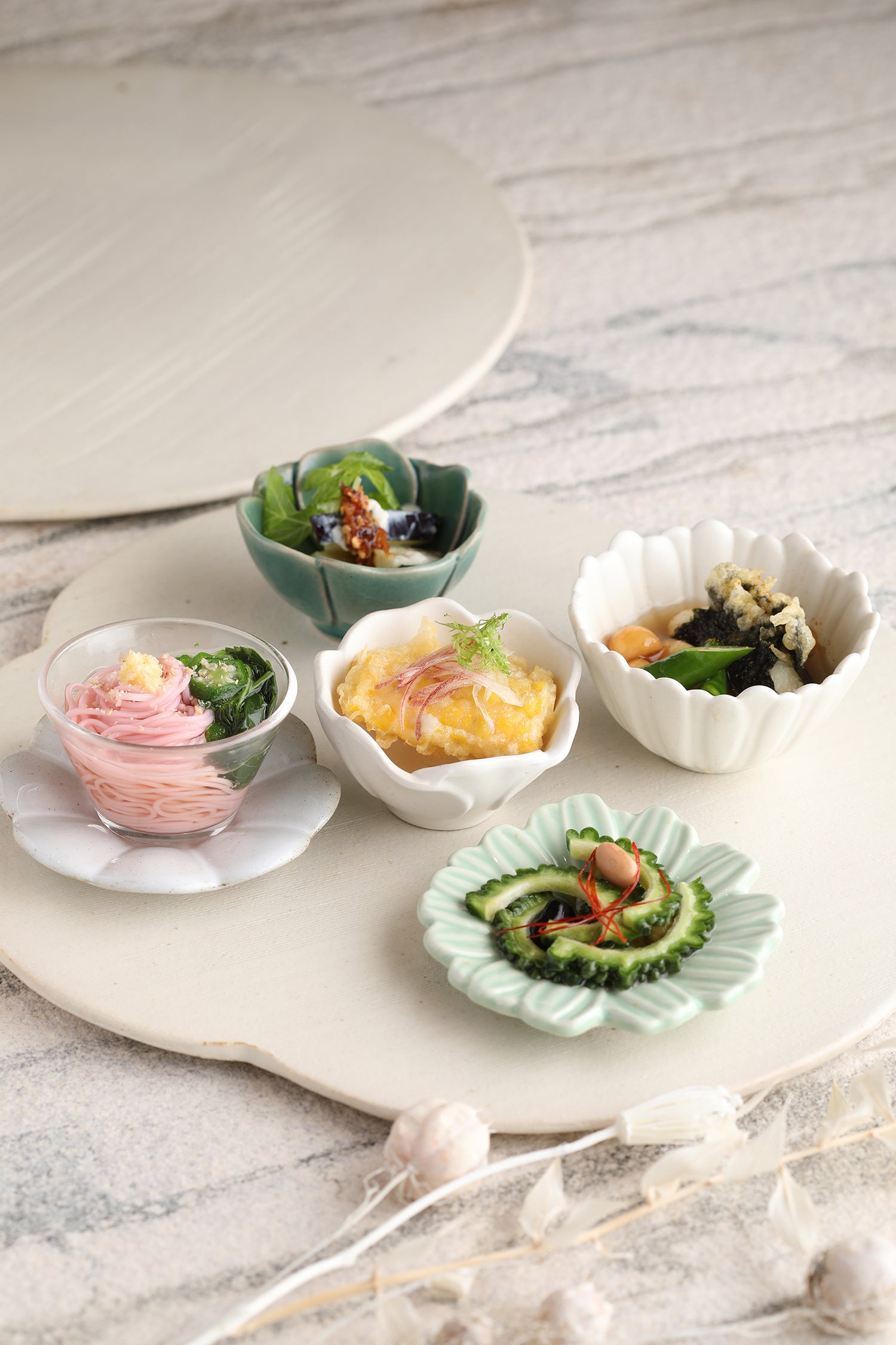 とうもろこしの天ぷら 梅そうめんとおくらモロヘイヤ ゴーヤの黒酢漬け 夏野菜揚げ出し 水茄子のクリームチーズ和え