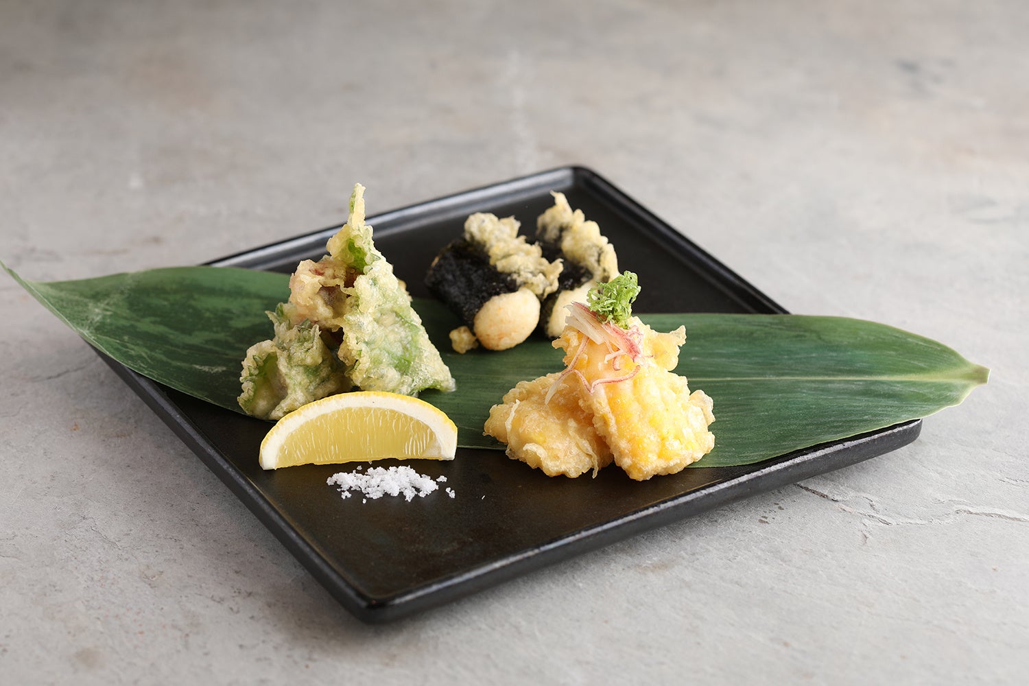 旬の素材を使用した三種の天ぷら盛り合わせ。やなぎだこは大葉で包んで天ぷらにしました。たこの天ぷらは大葉の状態を見極めて短時間で揚げています。ふわとろのとろろ海苔巻き天ぷら、甘さが引き立ったとうもろこしの天ぷらを添えて、夏らしい一品に仕上げました。