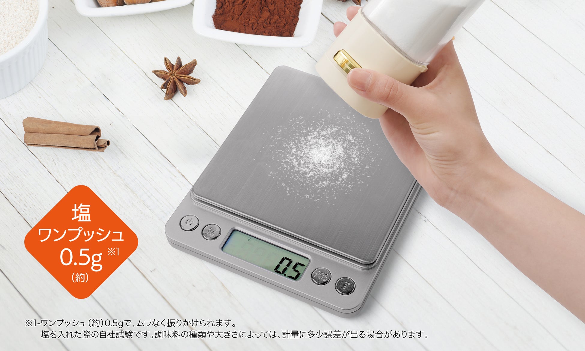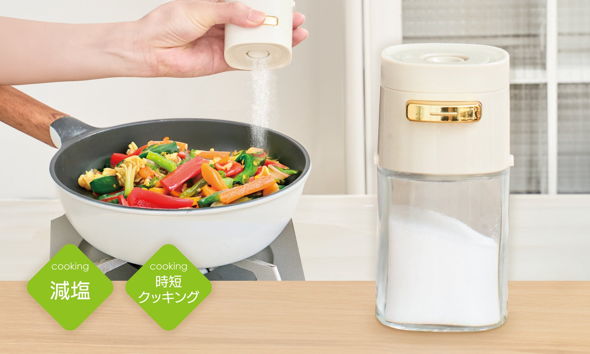 ワンプッシュで塩約0.5g!計量の手間を省いて時短クッキング♪調味料のムダ使いや入れ過ぎを防止してヘルシークッキング♪
