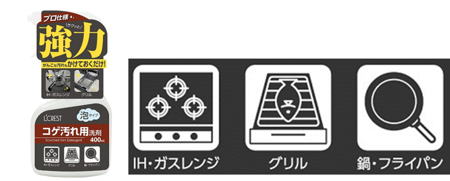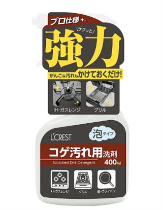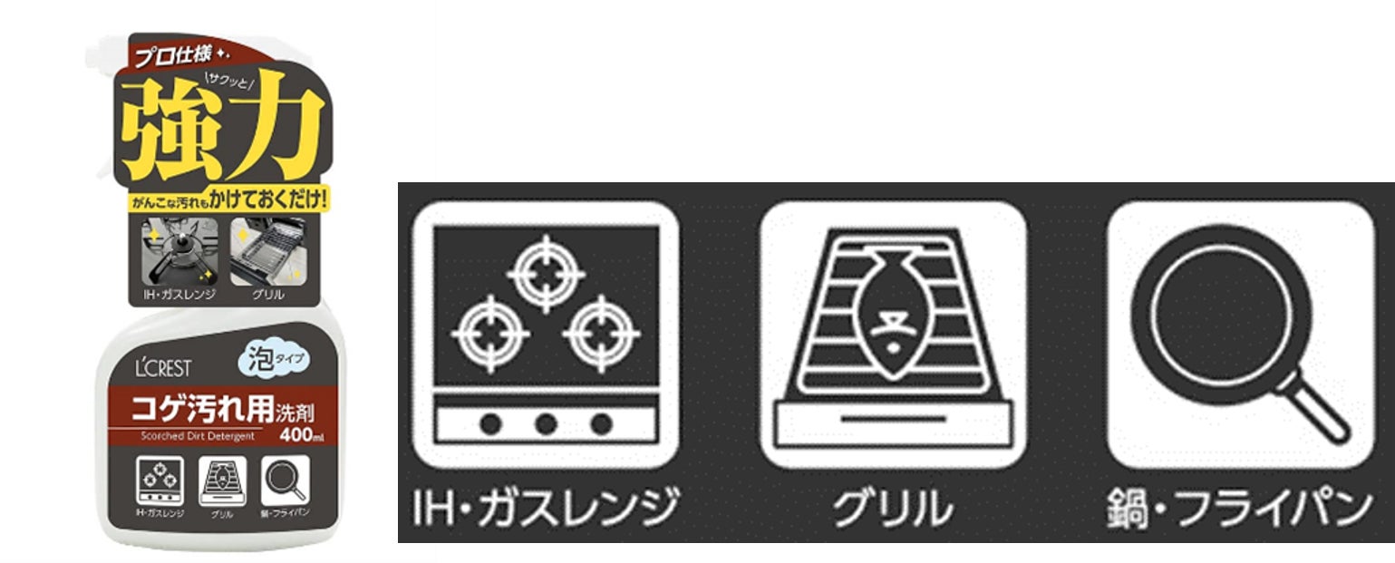 泡タイプでコゲ汚れにグングン浸透。五徳、魚焼きのグリル、オーブンの受け皿、鍋などの頑固な汚れを簡単に、綺麗に落とすことができます。
