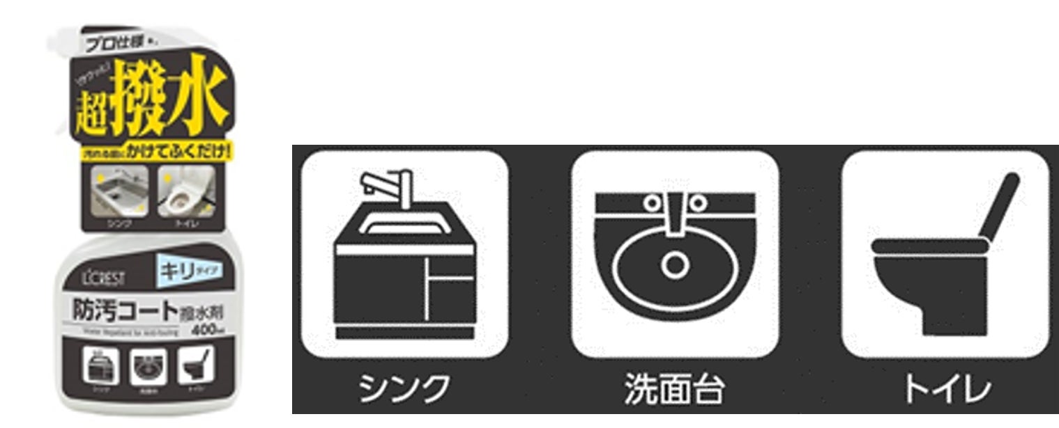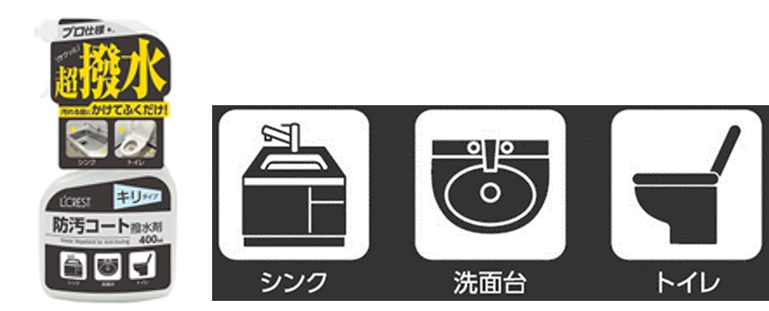 スプレーして拭くだけのキリタイプ。洗面台や浴室といったご家庭の水周りの汚れを弾いて防止。