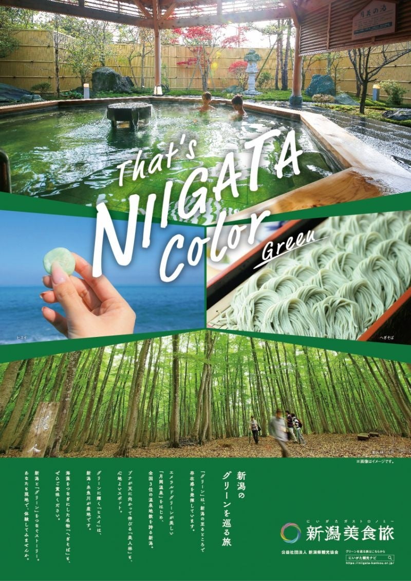 緑(春の県内):月岡温泉(新発田市)=ヒスイ(糸魚川市)=へぎそば=美人林(十日町市)
