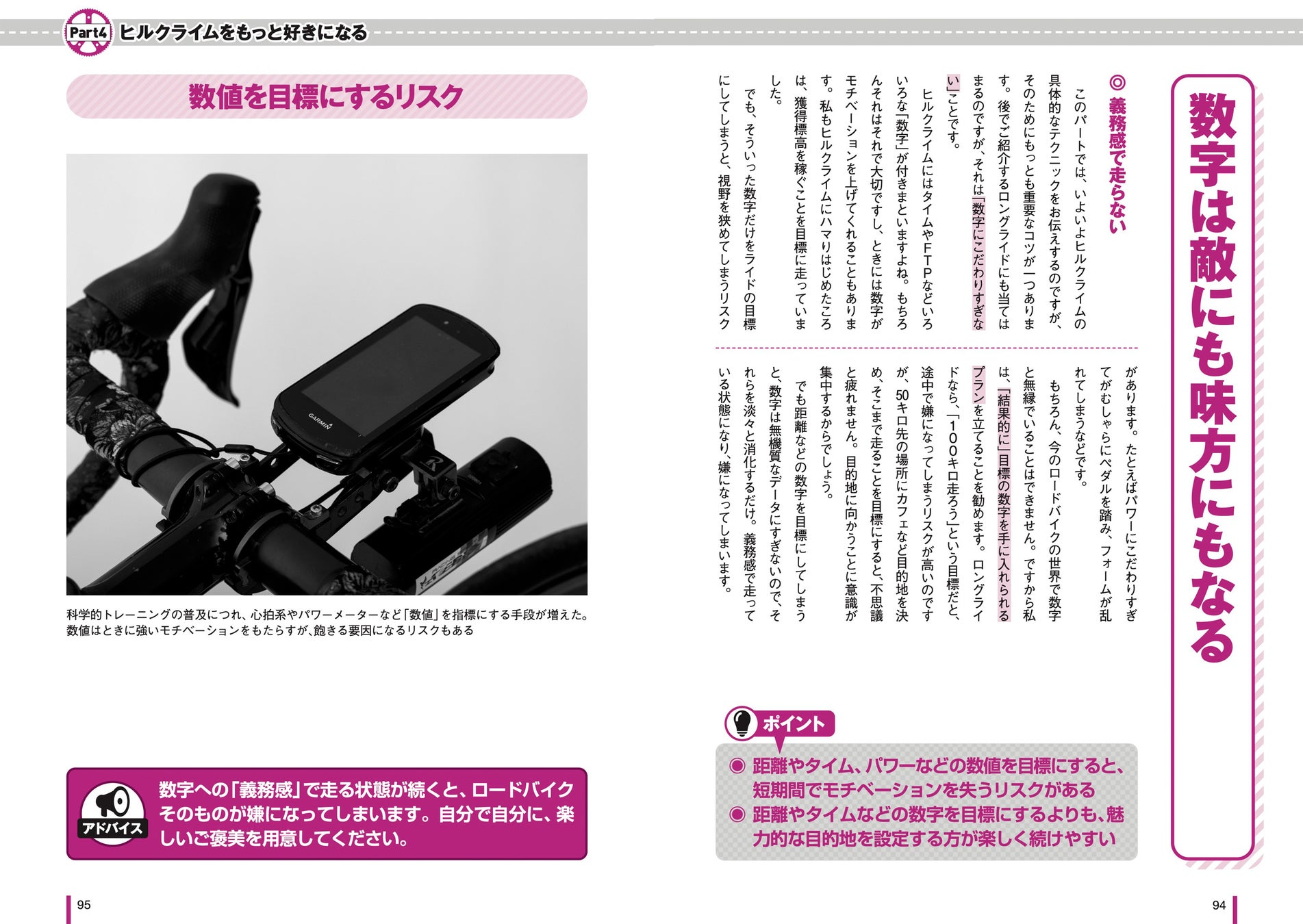 本書のターゲットはヒルクライムレースへの参加&タイムの短縮を目指す層や、無理なく登れるようになることで走る距離を延ばしていきたい初中級者です。パワートレーニングにとらわれるのではなく、ヒルクライムレースや峠を含むロングライドを「安全に」より速く・ラクに走ることを追求。「ロードバイクに乗ることがもっと楽しくなる!」ステップアップを目指すための1冊です。