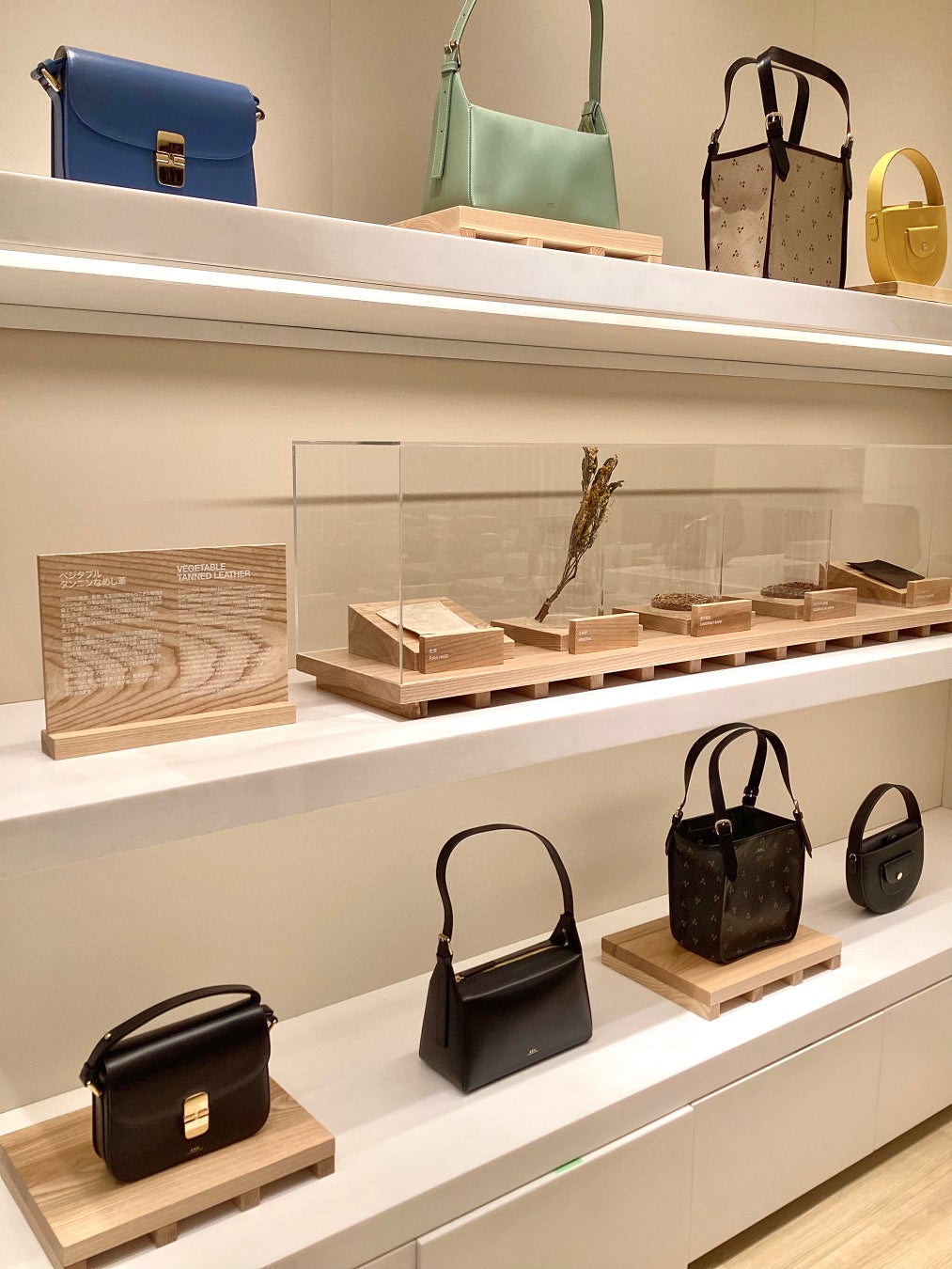 A.P.C.では、ベジタブルタンニンで鞣されたレザーバッグやスモールレザーグッズを多く展開しています。同POP UPにてベジタブルタンニンレザーアイテムの年月が経つにつれ美しいパティナ(古艶)、経年変化されたバッグの展示をいたします。