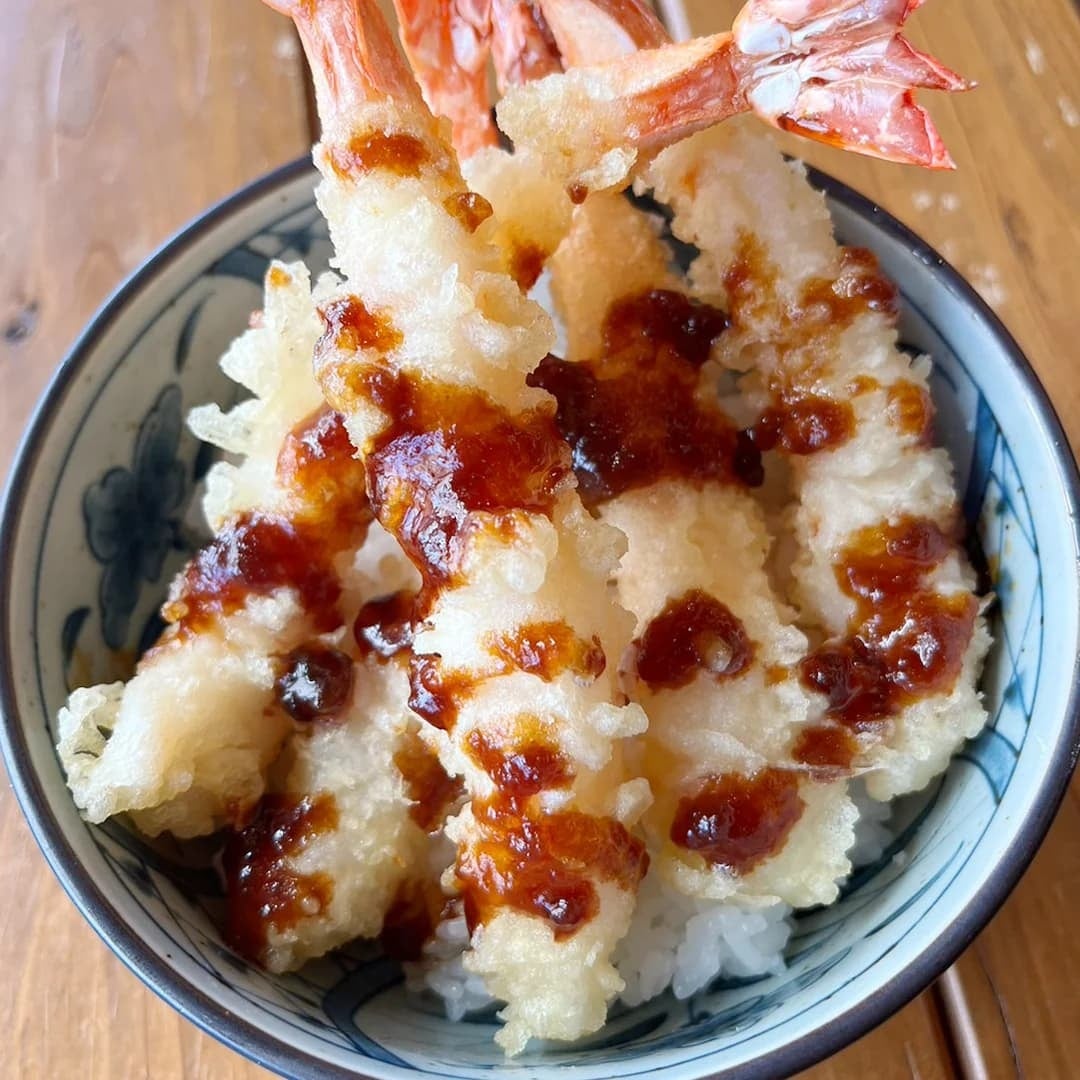 丁寧に下処理したエビをこだわりの油でカラッと天ぷらに!直火の釜で炊いた熱々のお米にのせて、天丼のタレをかければエビ天丼の完成!ぜひご賞味ください。
