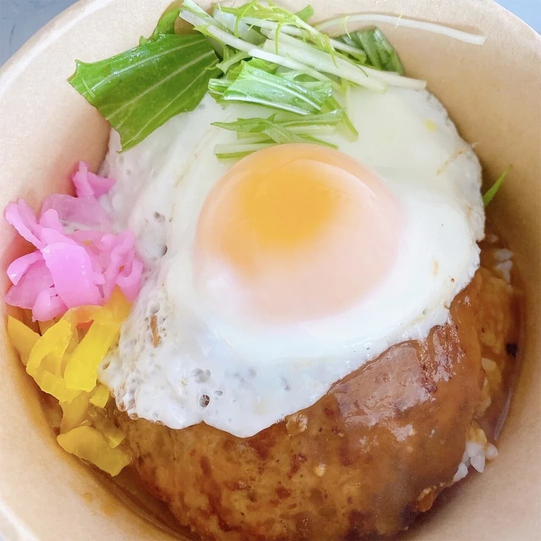 お店でも人気なロコモコ丼を提供します。大きなハンバーグは肉汁たっぷりジューシーな味わい。オリジナルソースで煮込んだハンバーグです。ハワイのローカル丼でアロハな気分を味わっていただけます♪