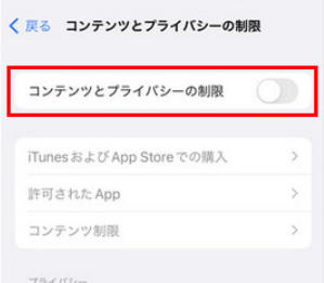 ステップ3:「コンテンツとプライバシーの制限」をタップし、スクリーンタイムパスコードを入力し、「コンテンツとプライバシーの制限」をオフにします。