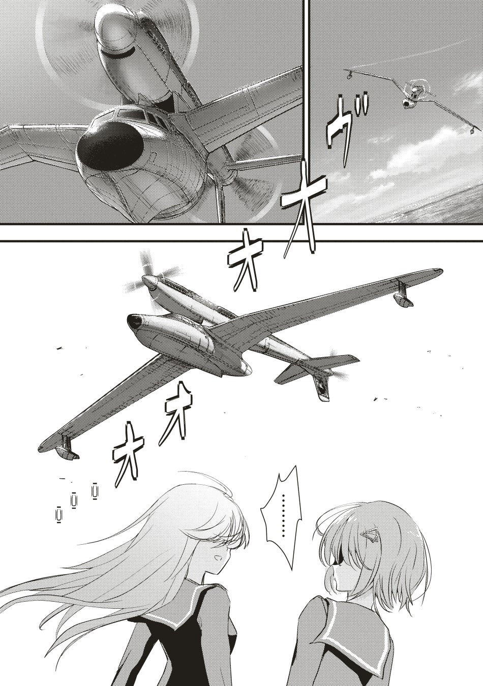 海の青と空の青の間を切り裂く、白く輝く飛空艇の翼が少女たちの想いを導きます!