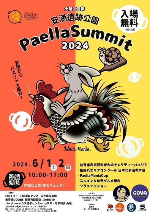また、選考会以外にも能登半島地震被災地を応援する企画「防災チャリティーパエリャ」も実施。1.5メートルの大鍋を使い約1000人分のパエリアを作り、1000円以上の募金に対してパエリア1人前を返礼品としてお返しします。集まった募金をもとに、特定非営利活動法人全日本パエリア連盟の会員ら有志が能登半島での復興支援炊出し活動を実施します。ほかにも、関西の有名スペイン料理店や地元の飲食店など約20店舗の飲食ブース出店、プロのフラメンコギタリストによるフラメンコショーなどが企画されています。