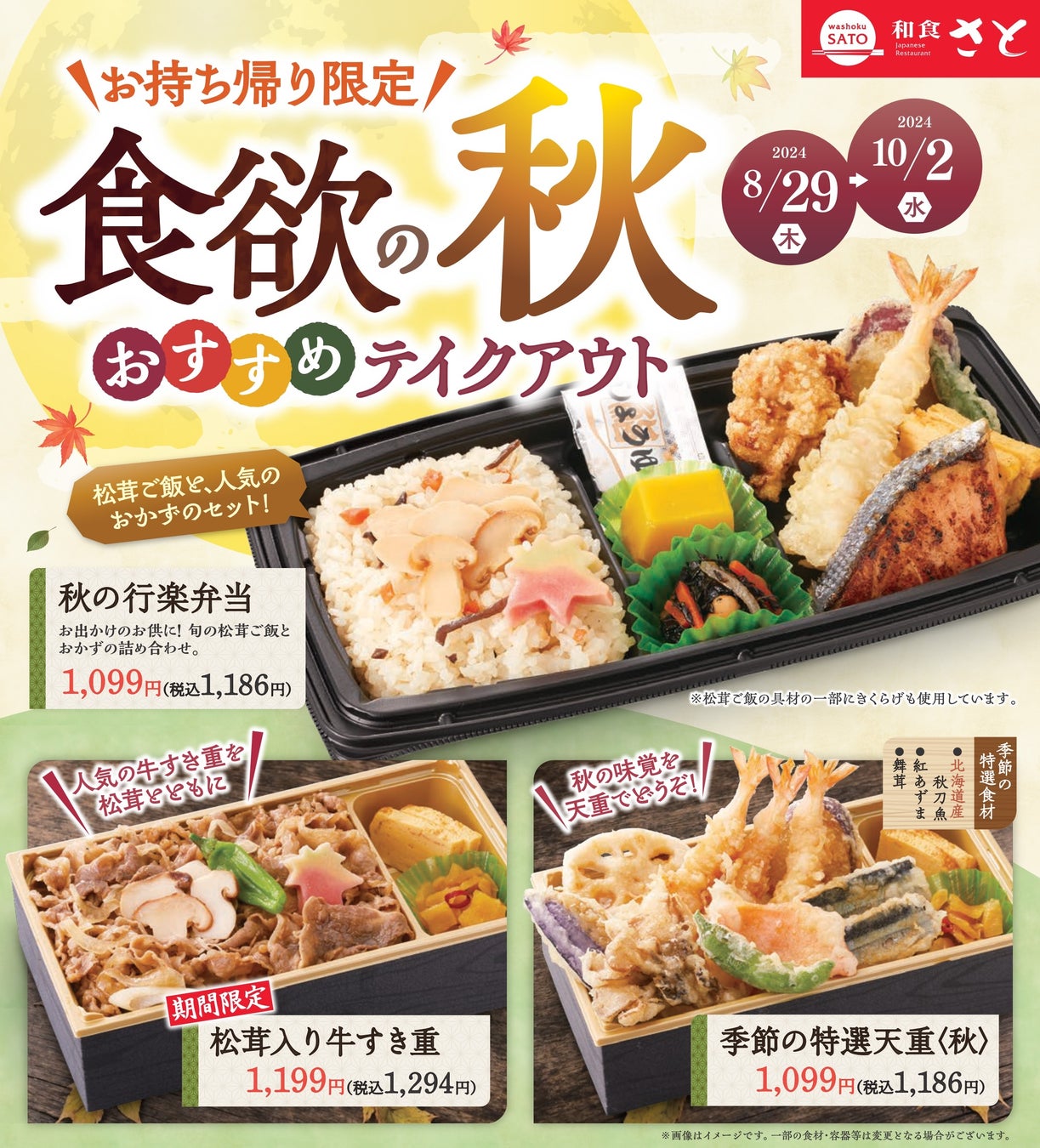 国内197店舗を展開する「和食さと」では、「食欲の秋」のお持ち帰りキャンペーンと題して、一足早く8月29日(木)から秋の味覚たっぷりなテイクアウトメニューを販売します。