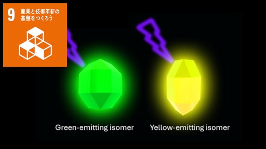 ・緑色と黄色の発光の起源が異性体のような構造関係にあることを解明。