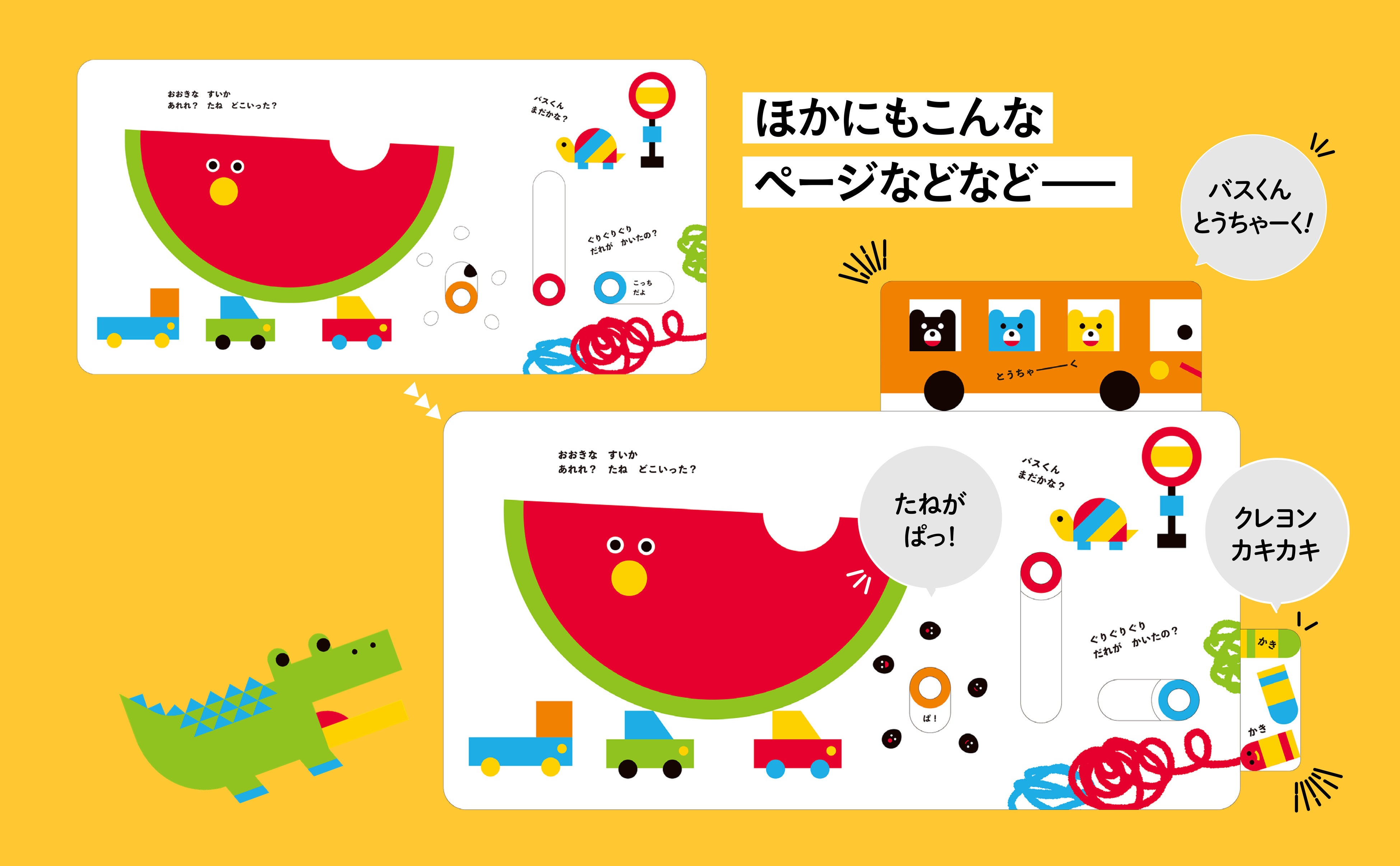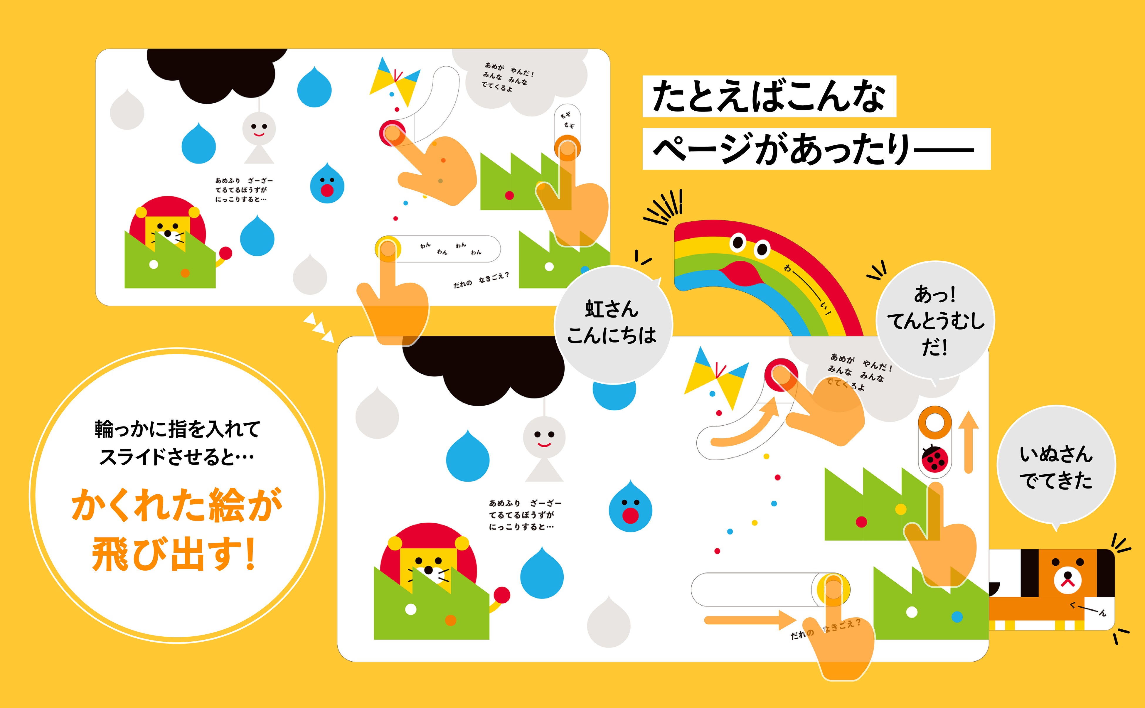 そして今月4月24日には、同書の特徴である「楽しさ」と「創造性」を盛り込んだ、しかけ絵本の最新作『ゆびから ぐいーん』を刊行予定です。穴に指を入れてスライドさせると、指先から色々なものが出てくる”しかけムービングえほん”となっています。