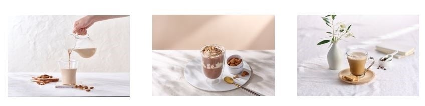 ぎっしり詰まったアーモンドの味わいが楽しめるアーモンドミルク「オリジン」2種類、特製のアーモンドミルククリームをトッピングした、素材にこだわったデザートドリンクの「クリームフローズン」4種類、アーモンドミルクと素材のおいしさが引き立てあい、毎日楽しめる「ブレンド」2種類、アーモンドミルクとすりつぶした野菜で作った「スープ」1種類です。生活の様々な場面で、おいしく楽しく続けられるようにこだわったラインアップとなっています。