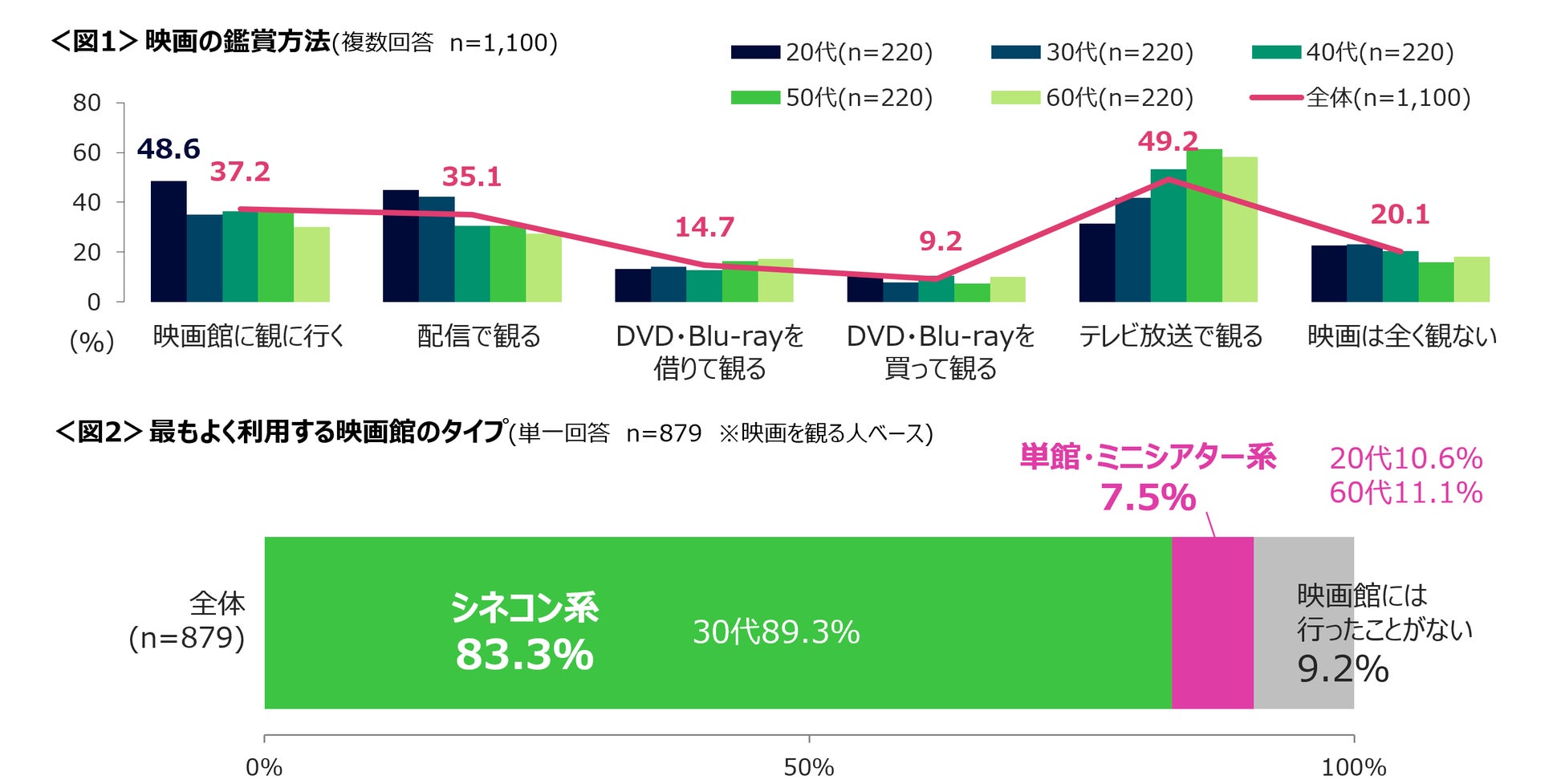 シネコン系は30代が89.3%で最も多く、単館・ミニシアター系は60代が11.1%で最も多く、20代が10.6%で続く。