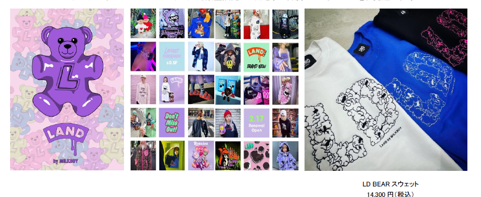 ユニセックスウェアを展開する「LAND by MILKBOY」がリニューアルオープン。オリジナルウェア・雑貨はもちろん、不定期でリリースするさまざまなキャラクターとのコラボ商品やソフビトイなど、気になるアイテムが盛りだくさんなコンセプトストアです。今季はカラフルなグミモチーフのクマがかわいい“LAND GUMMIES”シリーズや銃を持った天使達がクレイジーな“SAINT”シリーズなど新シリーズが続々と登場いたします。リニューアルオープン記念アイテムとしてLAND BEARまみれになったLD BEARスウェットも数量限定でご用意。注目度MAXなLANDをお見逃しなく。