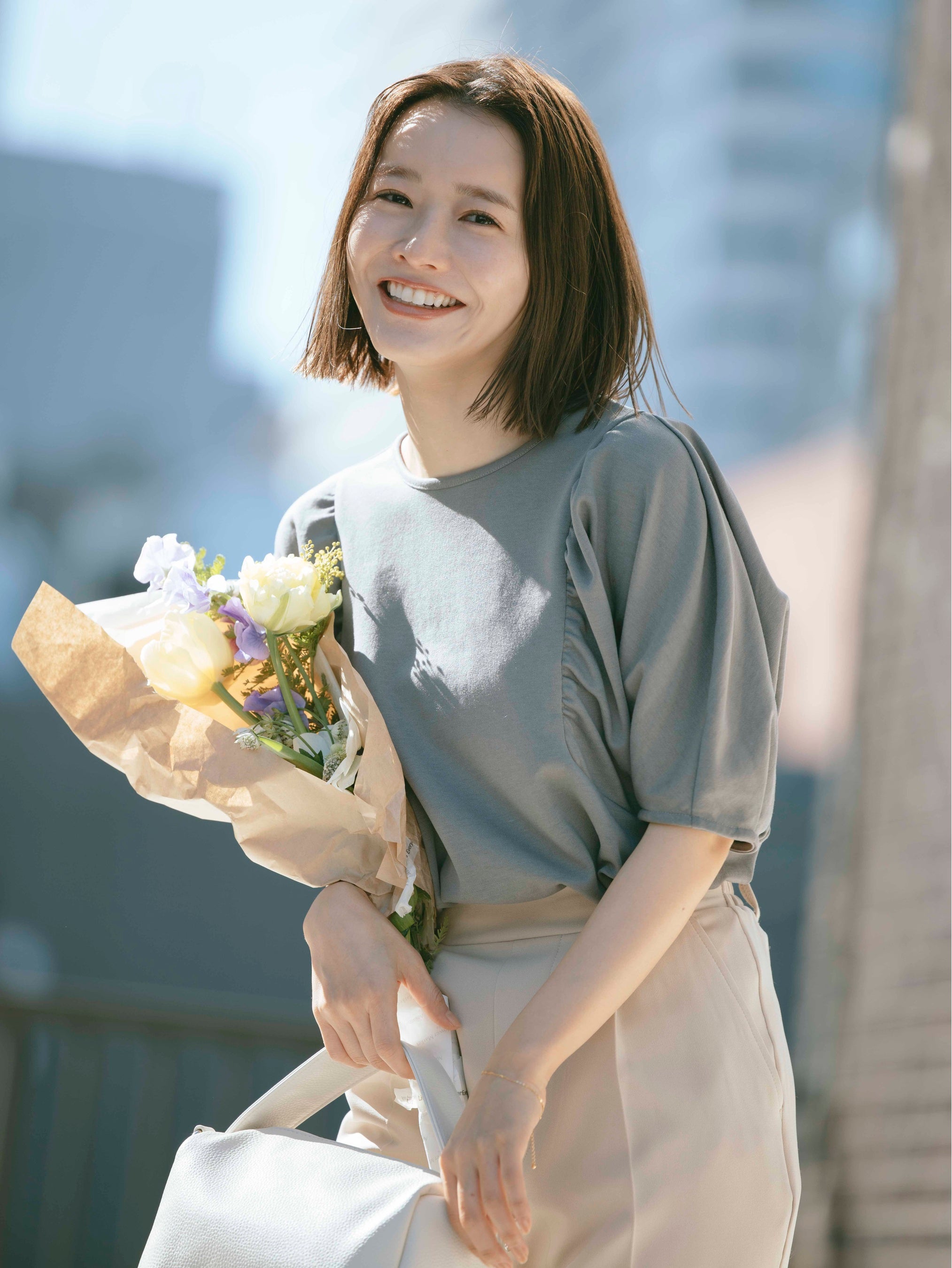 ・袖まわりのギャザーが女性らしい印象に