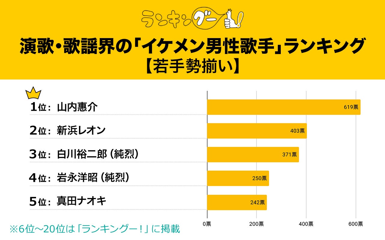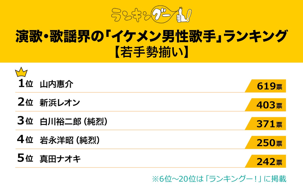 調査方法:株式会社CMサイトがインターネットリサーチした<演歌・歌謡界の「イケメン男性歌手」ランキング>のアンケート結果を集計。