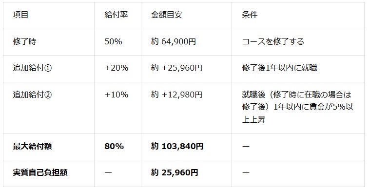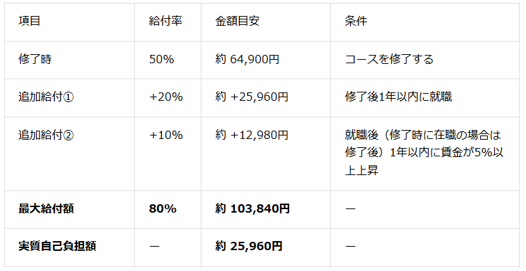 これにより、一定の条件を満たす方は、受講料129,800円(税込)のうち50%にあたる約64,900円の給付金をハローワークから受け取ることができます。さらに、修了後の就職や賃金上昇などの条件を満たした場合は、最大80%(約103,840円)まで給付を受けることが可能です。