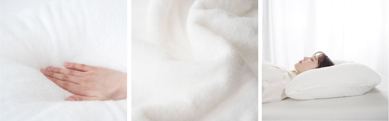 枕の中素材には、しっとりとした独特のやわらかさを持つわた素材「やわ綿極み」を使用。その感触をいかすため、側生地には、アミノ酸でトリートメントされた柔軟性の高い生地を使用しています。徹底的にやわらかさにこだわることで、とろけるようにやわらかな寝心地を実現しました。