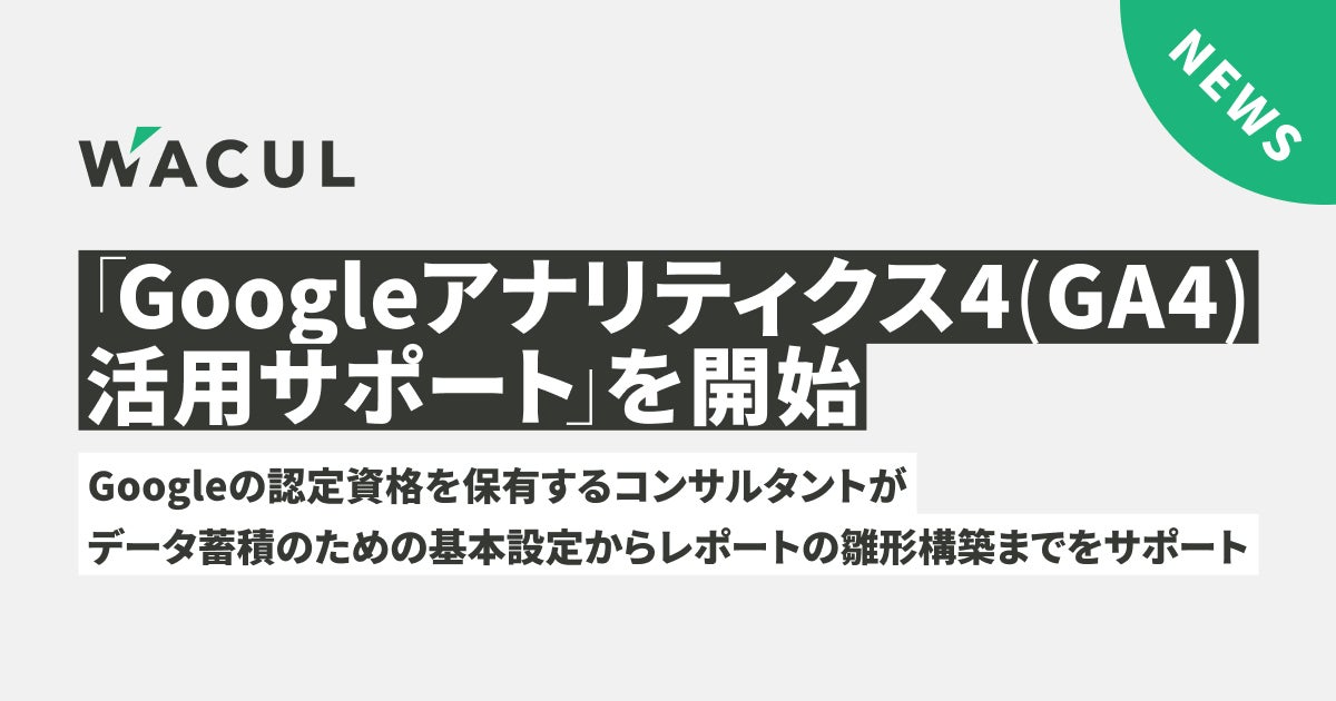 データと知見を核に、戦略から実行までマーケティングDXを一気通貫で支援する株式会社WACUL(本社:東京都千代田区、代表取締役社長:大淵 亮平、証券コード:4173、読み:ワカル、以下当社)は、Googleアナリティクスのレポート作成とマーケティング施策の提案を行う『AIアナリスト』を累計約4万サイトに提供してきたノウハウを活かして、『Google アナリティクス4(GA4)活用サポート』を開始しました。