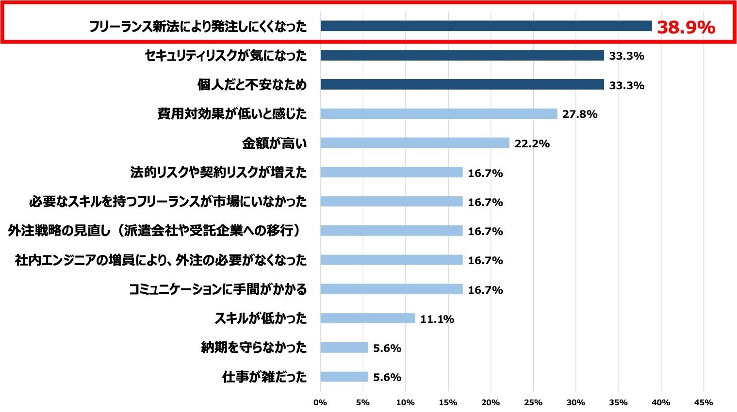 Q1で「やや減った」、「かなり減った」と回答した人に、Q2で「ITフリーランスエンジニアへの発注が減った理由」を聞いたところ、「フリーランス新法により発注しにくくなった」が38.9%で最も多く、次いで「セキュリティリスクが気になった」、「個人だと不安」がともに33.3%と続きました。フリーランスを守るための法案が、企業によっては社内体制や整備に時間がかかり、フリーランスへの発注ハードルを上げてしまっているなどのケースが考えられます。