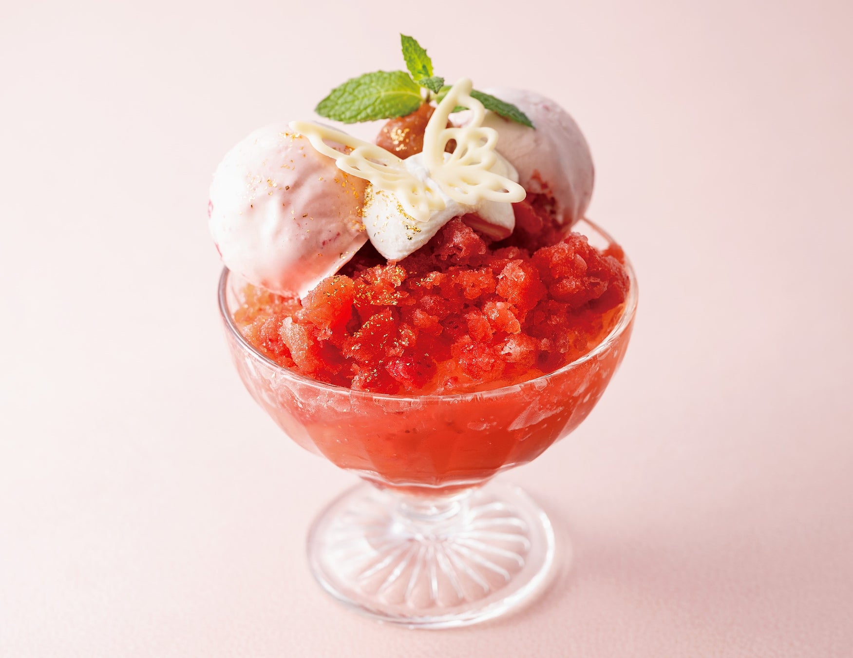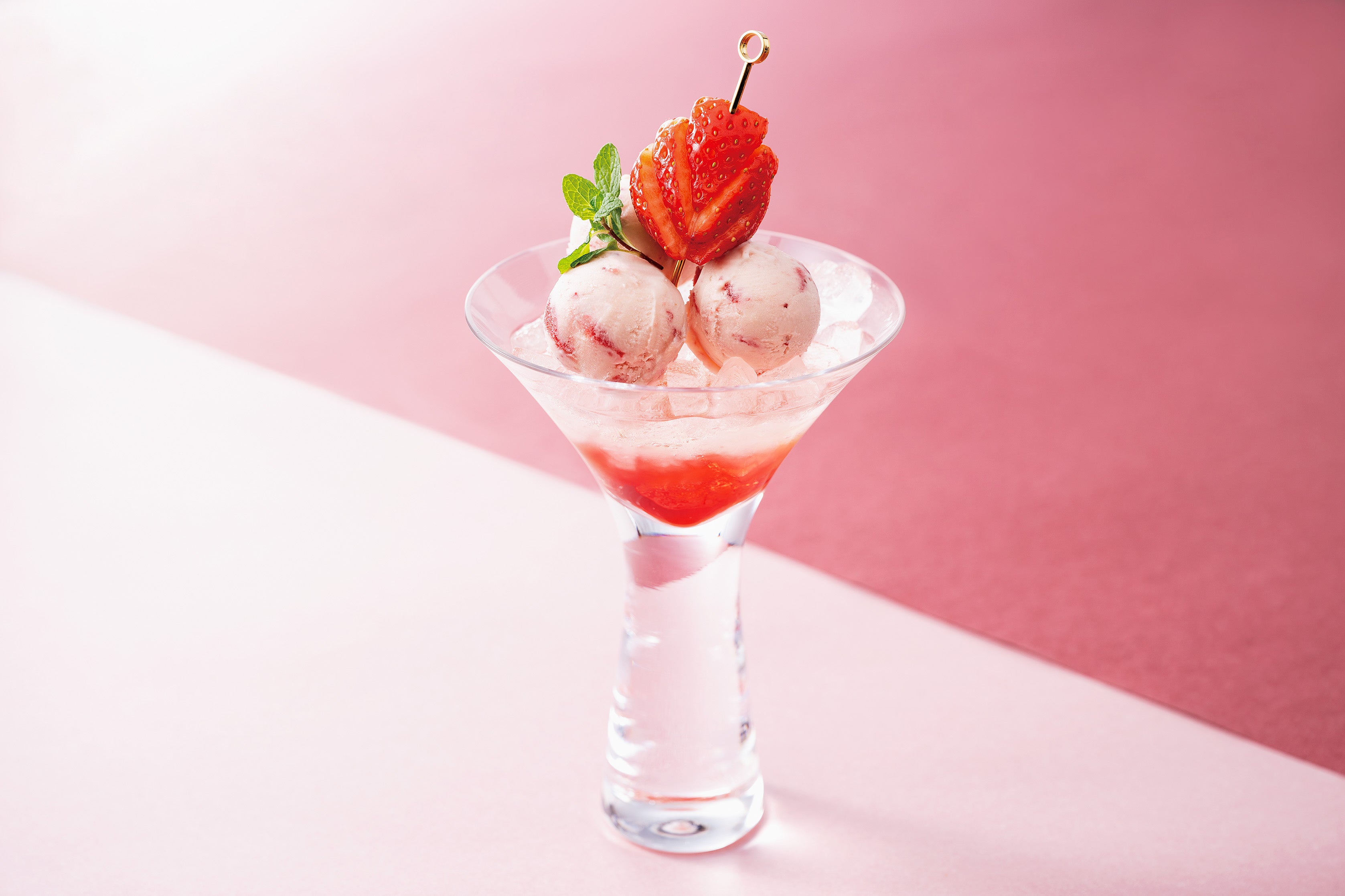 イチゴの果肉入りソースに、イチゴゼリーとイチゴのグラニテを重ね、ハーゲンダッツのストロベリーアイスクリームをのせました。