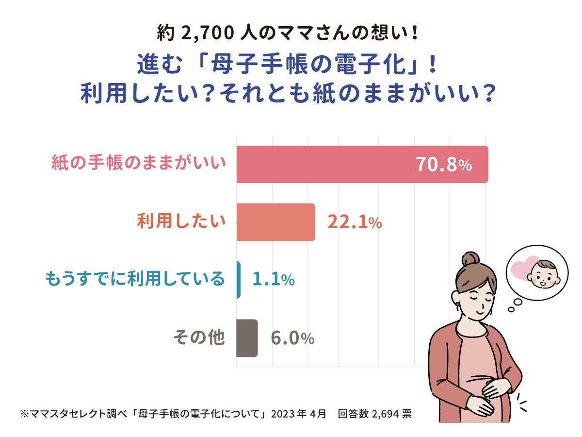 そこで今回ママスタセレクトでは「母子手帳の電子化」についてママたちの意見を聞きました。「利用したい」「すでに利用している」「紙の手帳のままがいい」「その他」を選択肢に設定したところ、2,694票の回答を得ることができました。