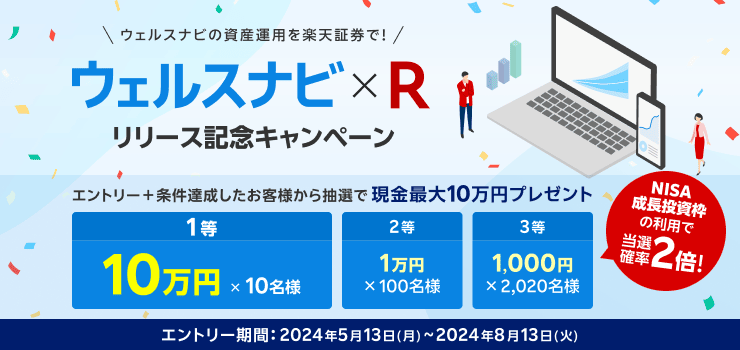 同時に、2024年8月13日までの期間内に条件を満たしたお客様に抽選で最大10万円をプレゼントする「現金最大10万円が当たる!【ウェルスナビ×R 】リリース記念キャンペーン!」を実施しております。