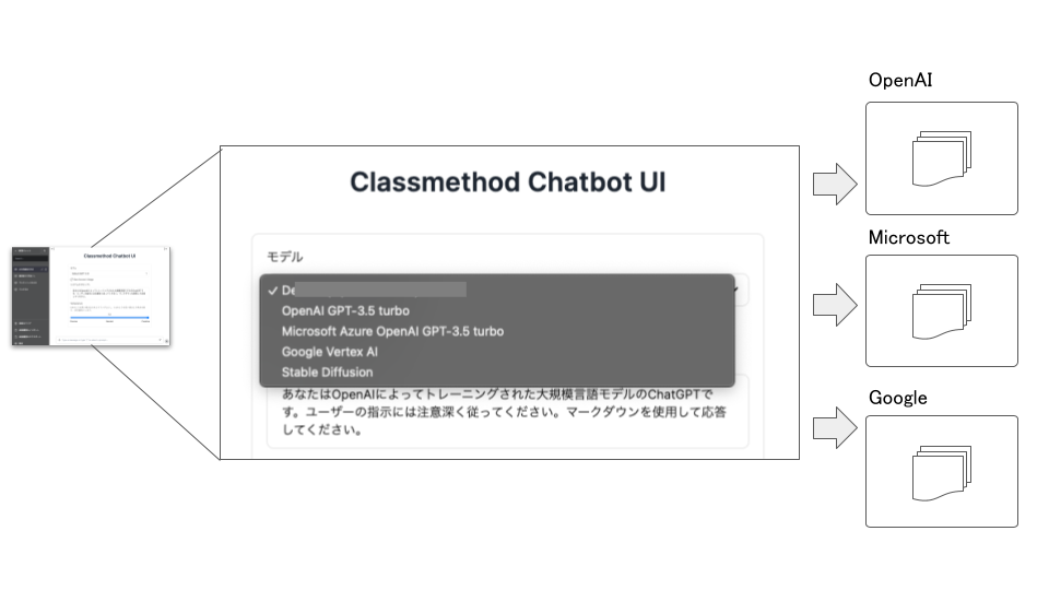各社の文章生成AIから画像生成AIまで、さまざまなサービスを同一の画面から利用できる環境を提供します。