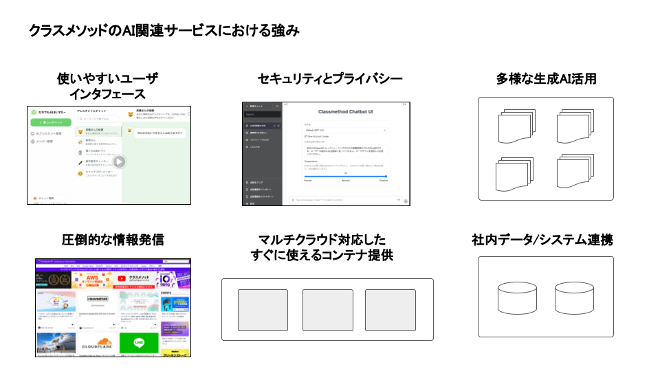 クラスメソッドは、複数の生成AIについて、お客様の業務環境への導入から活用に向けたノウハウ提供、アカウントの作成、円建て・請求書払いまでをパッケージで提供し、AI活用によるデジタルトランスフォーメーションの加速を支援します。