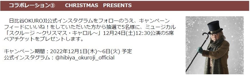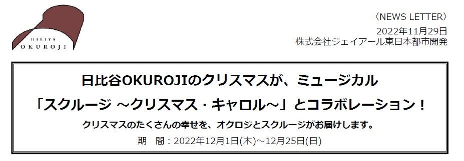 日比谷OKUROJIは、2022年12月1日~25日の期間、日生劇場で12月7日(水)から公演されるミュージカル「スクルージ ~クリスマス・キャロル~」とコラボレーションします。