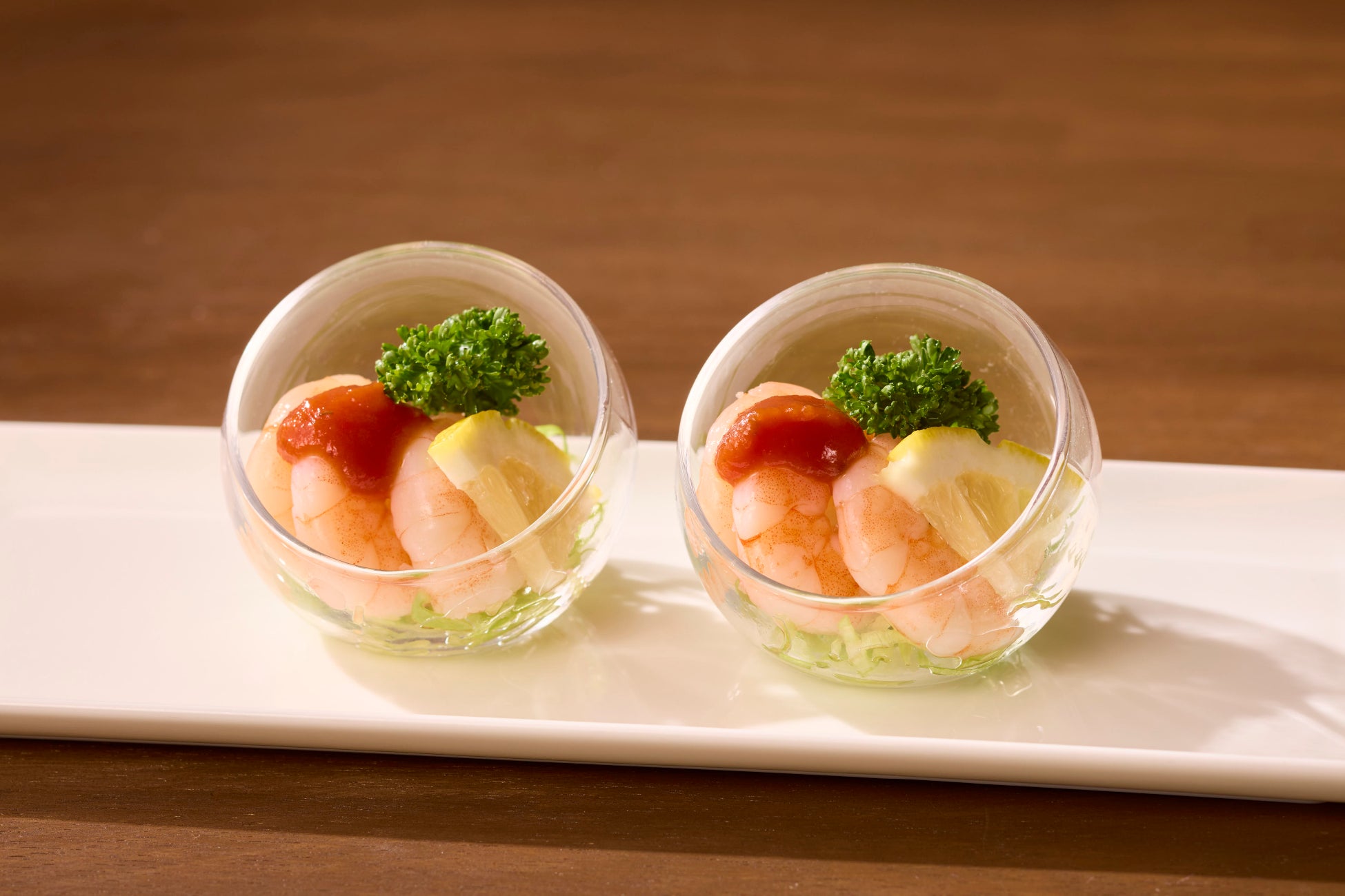 香味野菜と白ワインで風味を引き立てながら茹であげたエビに、刻みレタスとレモンを添えました。チリソースやレモンジュースの酸味に、西洋わさびの爽やかな辛味をきかせた自家製カクテルソースとともにお召し上がりください。
