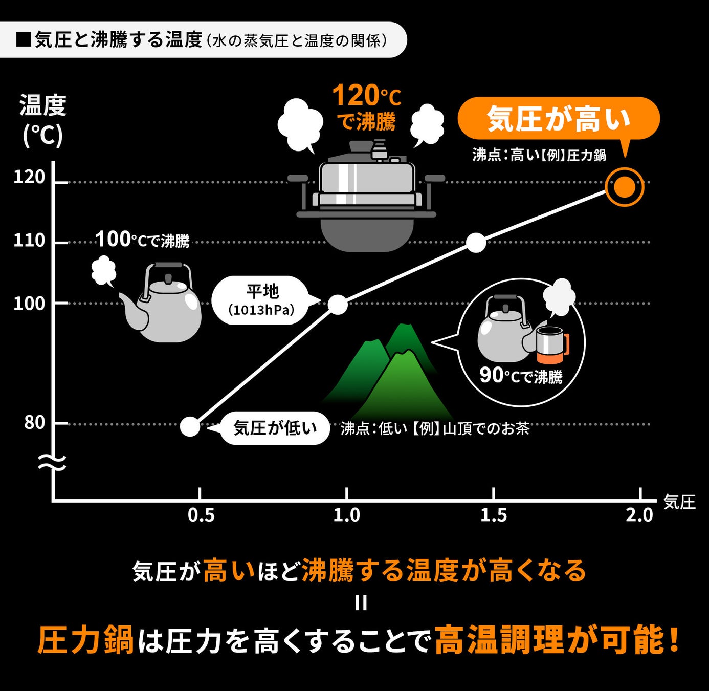 沸点が100℃から5℃上がると調理時間は30%短縮され、さらに110℃まで上がると半分ほどの時間まで短縮されます。これが圧力鍋で時短調理ができる理由です。