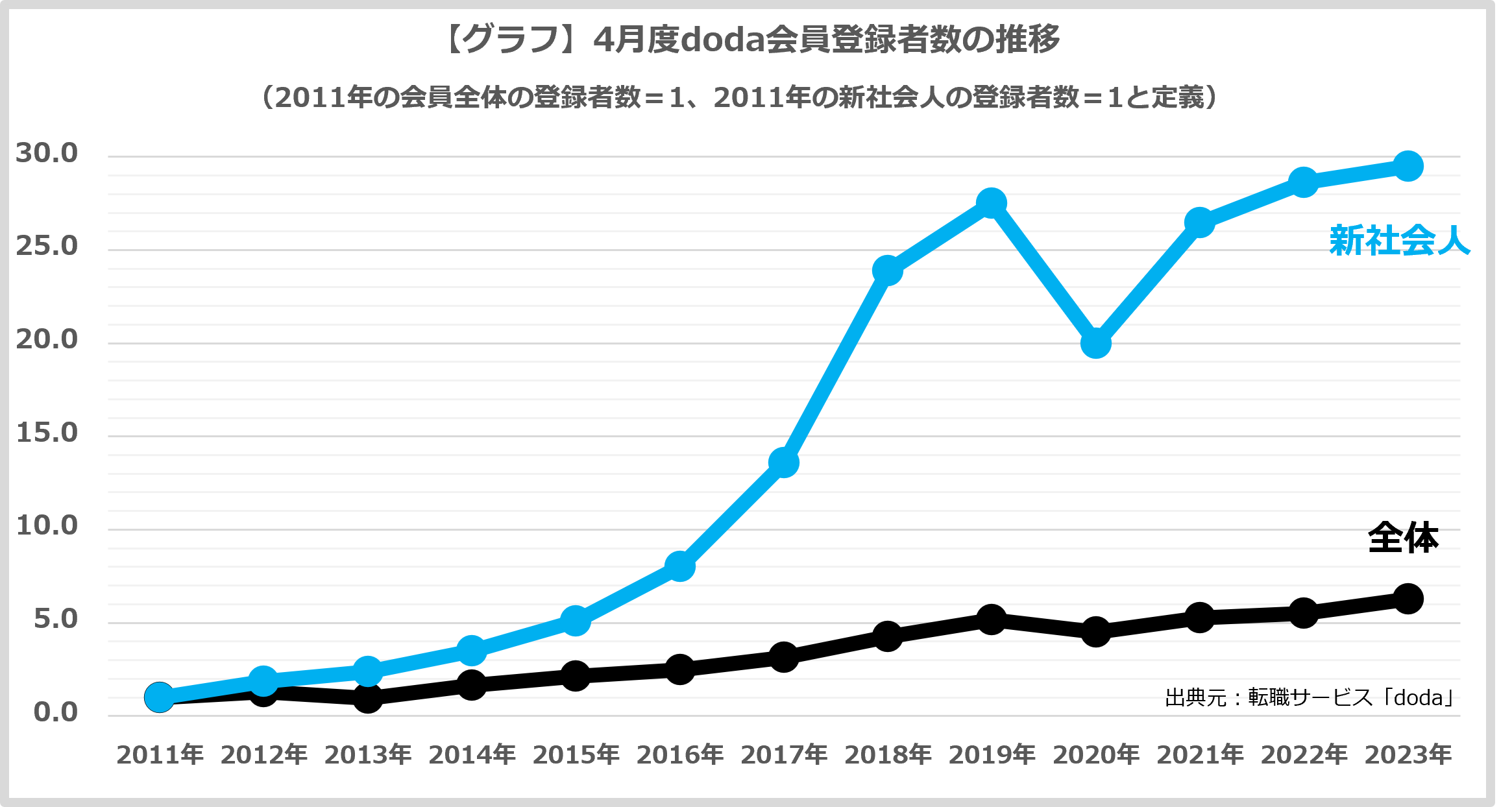 2023年4月に「doda」へ登録した新社会人は、これまでで一番多かった2022年を上回り、本調査を開始した2011年以降、過去最多となりました。また、2011年比で約30倍にまで増加しています。