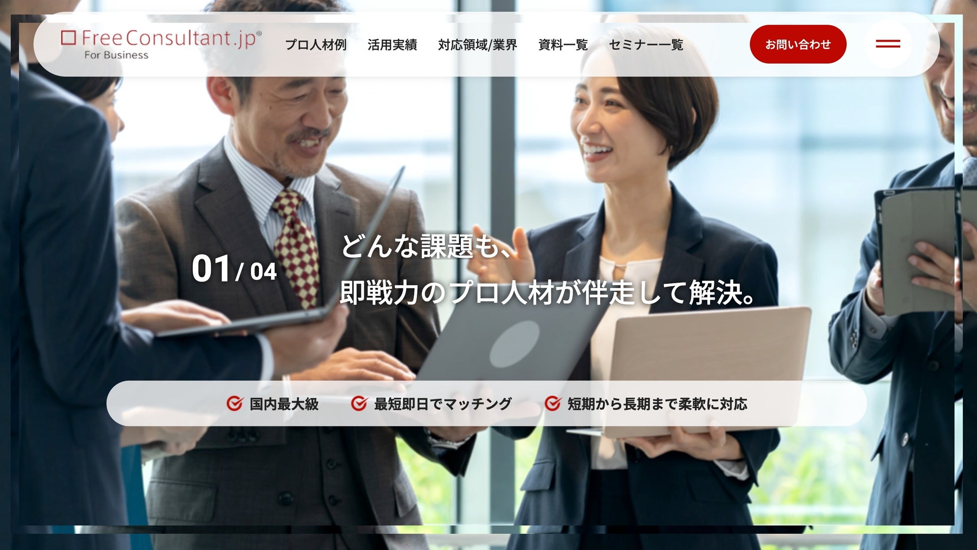 『フリーコンサルタント.jp』は、フリーランスのプロフェッショナル人材と企業をマッチングする日本最大級のプラットフォームです。