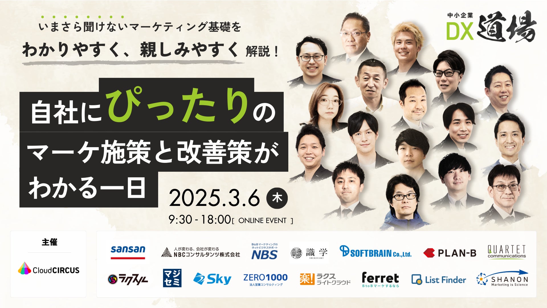 スターティアホールディングス株式会社(本社:東京都、代表取締役:本郷秀之、証券コード:3393)は、連結子会社でデジタルマーケティング事業を手掛けるクラウドサーカス株式会社(本社:東京都、代表取締役:北村健一)において、無料オンラインカンファレンス『中小企業DX道場 ~自社にぴったりのマーケ施策と改善策がわかる1日~』を2025年3月6日(木)9:30~18:00に開催、登壇者が決定したため、お知らせします。本イベントでは、中小企業向けに、業界でも著名な登壇者による親しみやすい解説を通じ、マーケティングの基礎から実践に役立つノウハウをお届けします。