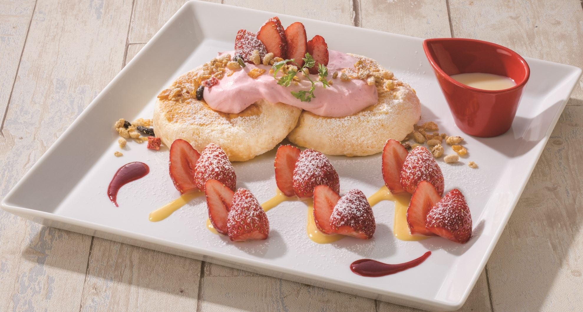 チーズが練り込まれたむさしの森珈琲で人気のパンケーキに、国産フレッシュいちごをふんだんにトッピングし、ヨーグルトが効いたいちごクリームととろ~り練乳を組み合わせた、甘さと酸っぱさが絶妙なバランスのシーズナルスイーツです。