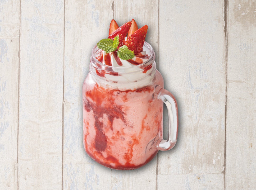 甘~いいちごのピューレをつかったなめらかなスムージーに、たっぷりのホイップと国産フレッシュいちごをトッピングしました。ボリュームもたっぷりで、デザート感覚でお召し上がりいただけます。