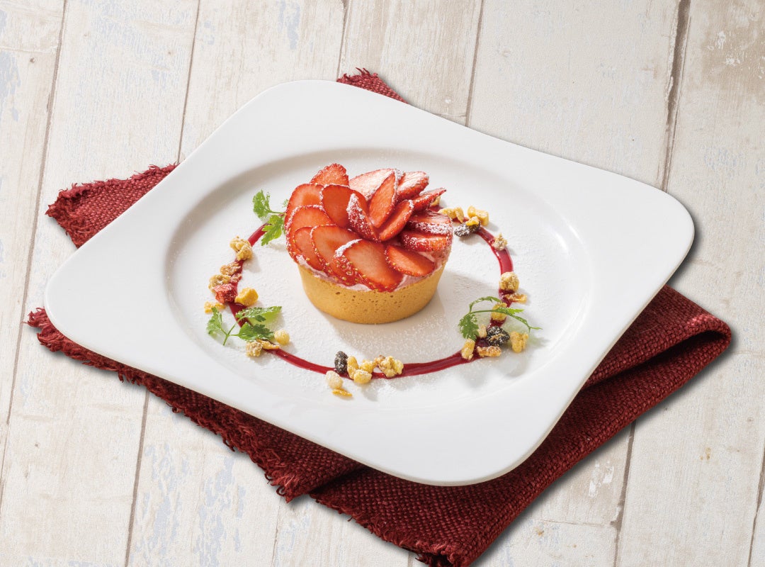 スライスされたいちごを花が咲いたように盛り付けた見た目もかわいらしいタルトは、オリジナルカスタードクリームと、ヨーグルトの入ったいちごクリーム、国産フレッシュいちごの組み合わせがマッチした逸品です。