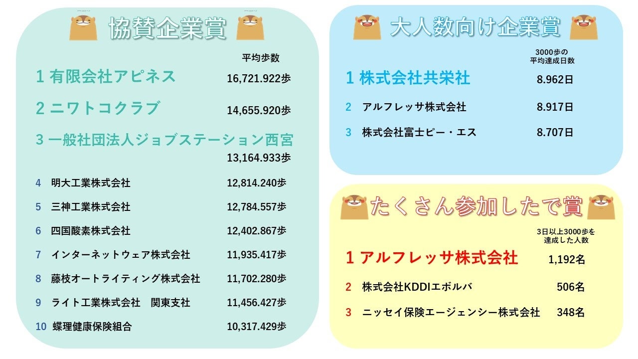 今回、過去最大となる250社、7,295名が参加し、第1弾と比較して参加企業数は11.4倍、参加者数は22.4倍となりました。(※1)このうち、見事入賞を果たした企業は下記表の通りです。3,000歩の平均達成日数が多い団体に贈られる「協賛企業賞」は、「10日」を記録した場合(全参加者が全日3,000歩を達成)、イベント期間の平均歩数で順位を決めるルールのため、上位チームは最後まで息の抜けない緊迫した展開となりました。50人以上参加の団体に贈られる「大人数向け企業賞」も、3,000歩の達成率が驚異の8割越えで、多くの方がイベントに継続して参加してくださいました。また今回特に驚いたのは、「たくさん参加したで賞」(3日以上3,000歩を達成した人数が多い団体)を受賞されたアルフレッサ株式会社様で、参加した1,253名のうち95.1%、1,192名が達成しました。独自の社内啓蒙を行いながら素晴らしい結果を残しました。