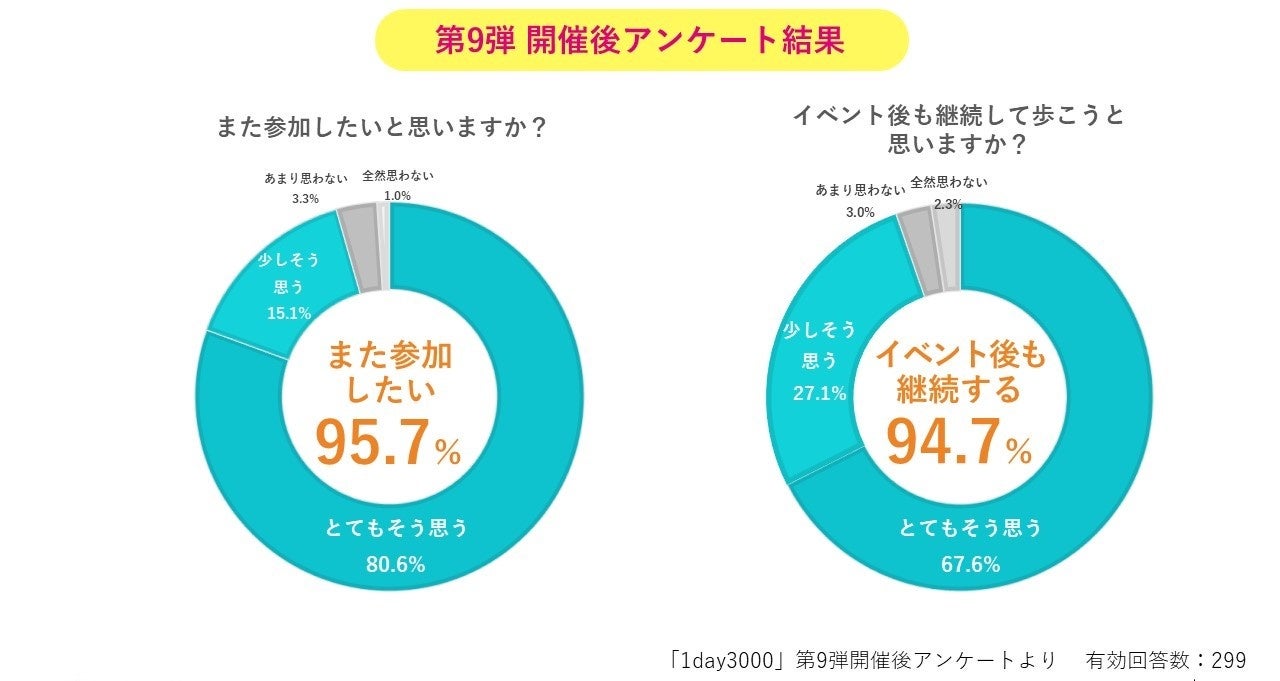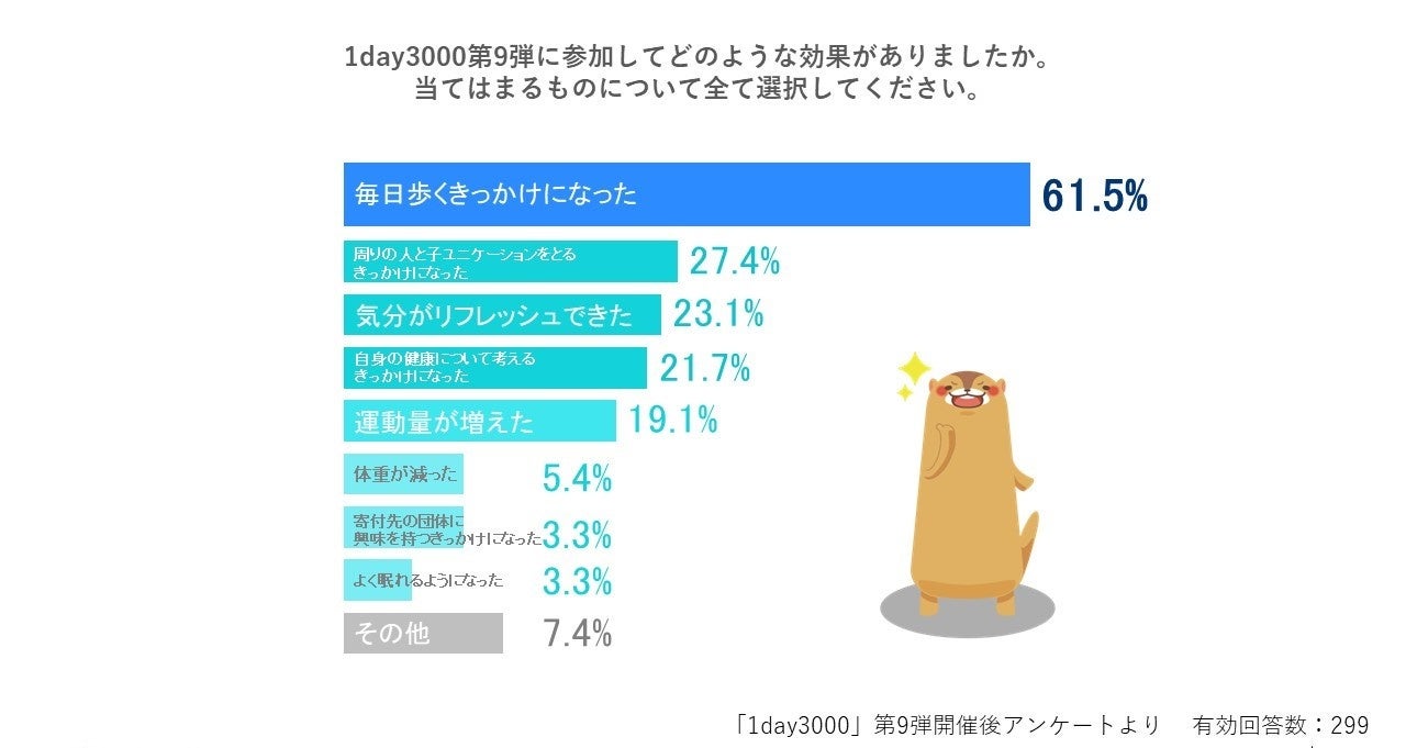 第9弾開催後にあたる7月14日~18日には参加者を対象にアンケート調査を実施しました。調査結果より、95.7%がイベントに再び参加したい意向があることが分かりました。さらにイベント後もウォーキングを継続するかという問いに対しては、94.7%に継続の意向がありました。さらに、「1day3000」に参加してどのような効果があったかという問いに対しては、「毎日歩くきっかけになった」という回答が6割を越え、この取り組みは運動を習慣化させる効果が高いことが分かります。「周りの人とコミュニケーションをとるきっかけになった」という回答は約3人に1人、「気分がリフレッシュできた」という回答は約5人に1人という結果で、ウォーキング以外の効果も実感している様子が伺えます。